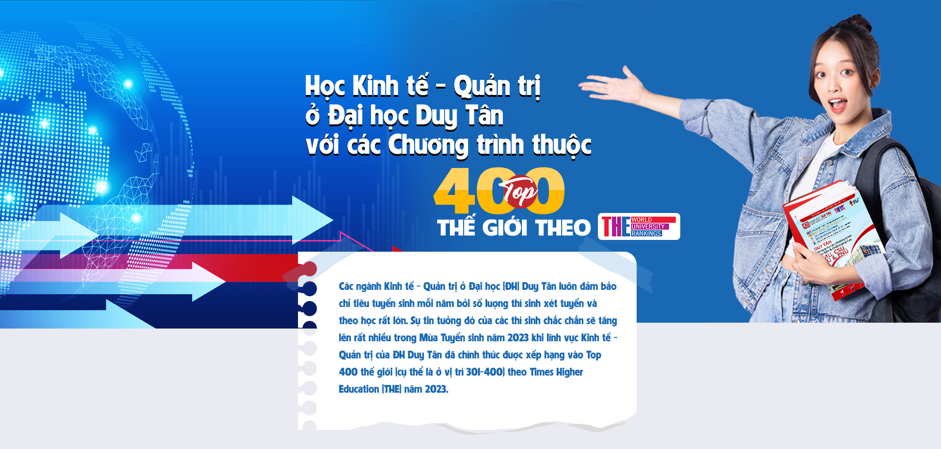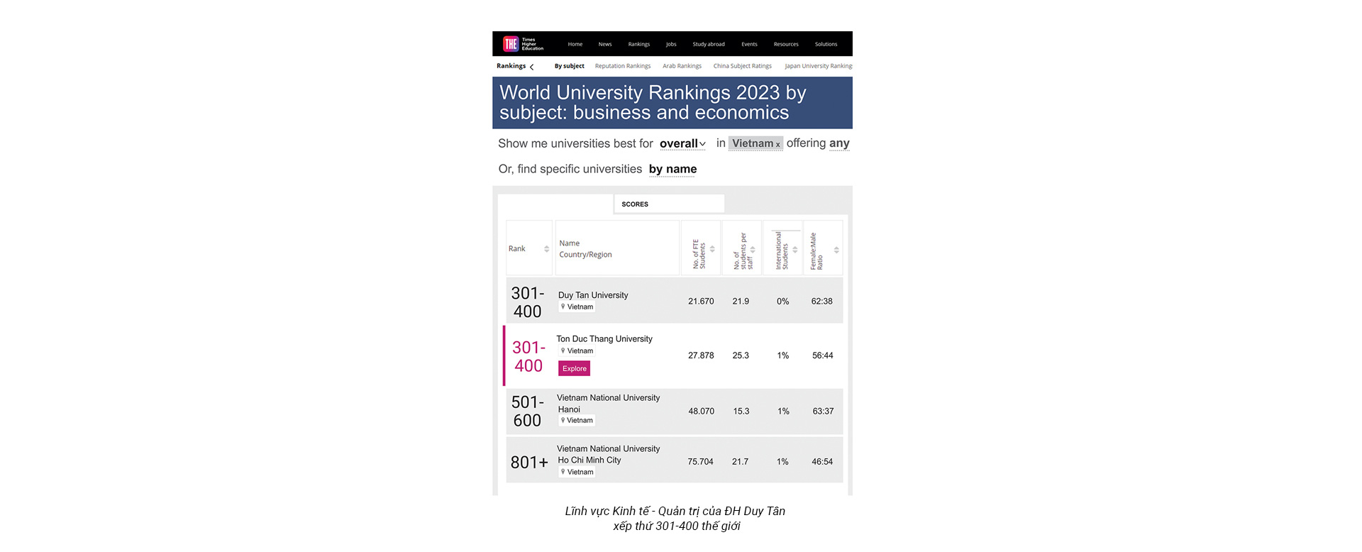 Theo Bảng Xếp hạng năm 2023 được THE công bố, cùng với xếp hạng tổng thể Đại học Duy Tân nằm trong Top 500 trường Đại học Tốt nhất thế giới, nhiều lĩnh vực cụ thể của Đại học Duy Tân theo đó cũng được xếp ở các vị trí cao. Trong đó, lĩnh vực Kinh tế - Quản trị của nhà trường được THE xếp ở vị trí Top 301-400 thế giới.