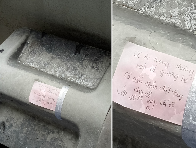 Cụ thể là, người bạn này hôm nay có lịch thi trên trường thì không biết đi đứng sao, ánh mắt "va" trúng vào một chiếc thùng rác. Điểm đặc biệt là trên nắp chiếc thùng rác này có một mảnh giấy nhớ màu hồng nho nhỏ, có nội dung: "Cô ơi, trong thùng rác có gương bể. Cô cẩn thận đứt tay nha cô. Lớp 10A7 xin lỗi cô ạ".