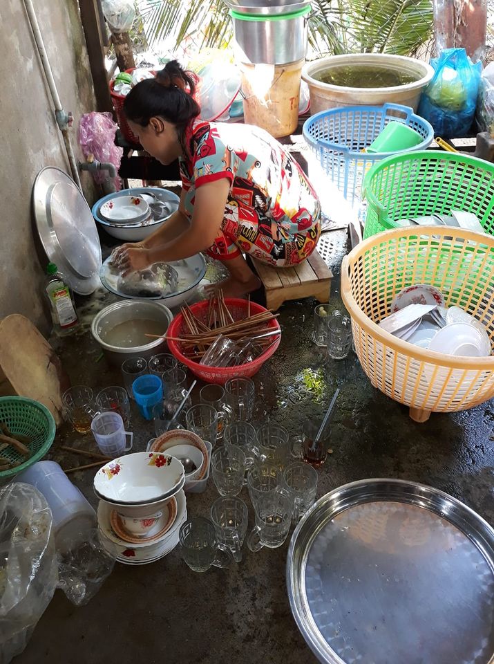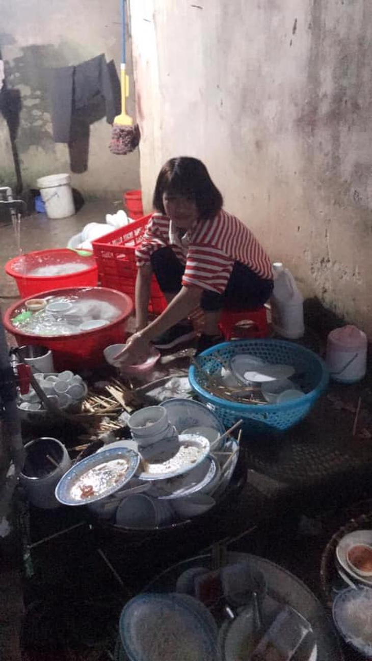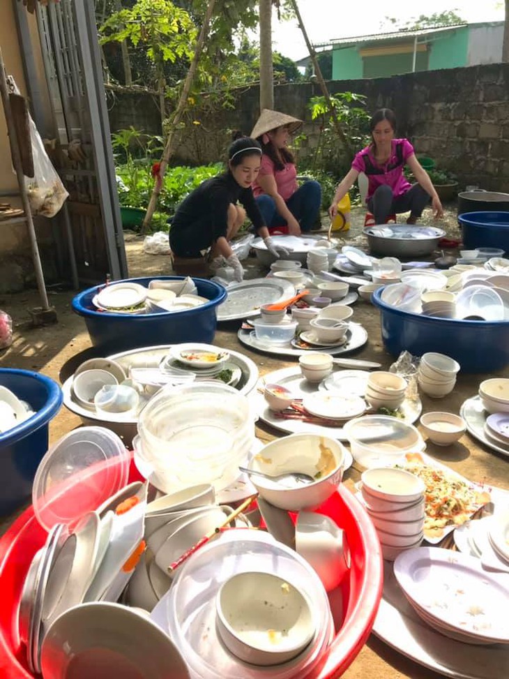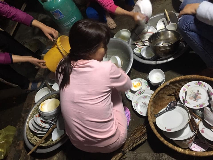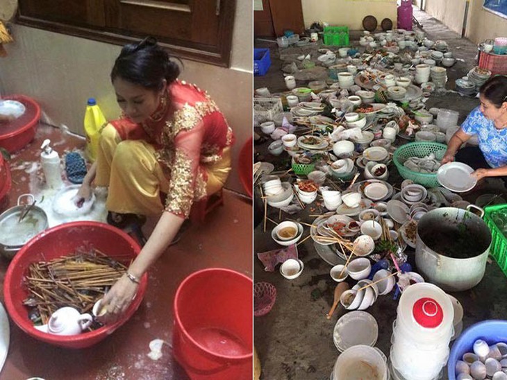 Cô dâu "không ngóc đầu" lên nổi khi trước mặt là "trận địa" bát đĩa của cỗ cưới vừa xong. (Nguồn Bảo Minh)