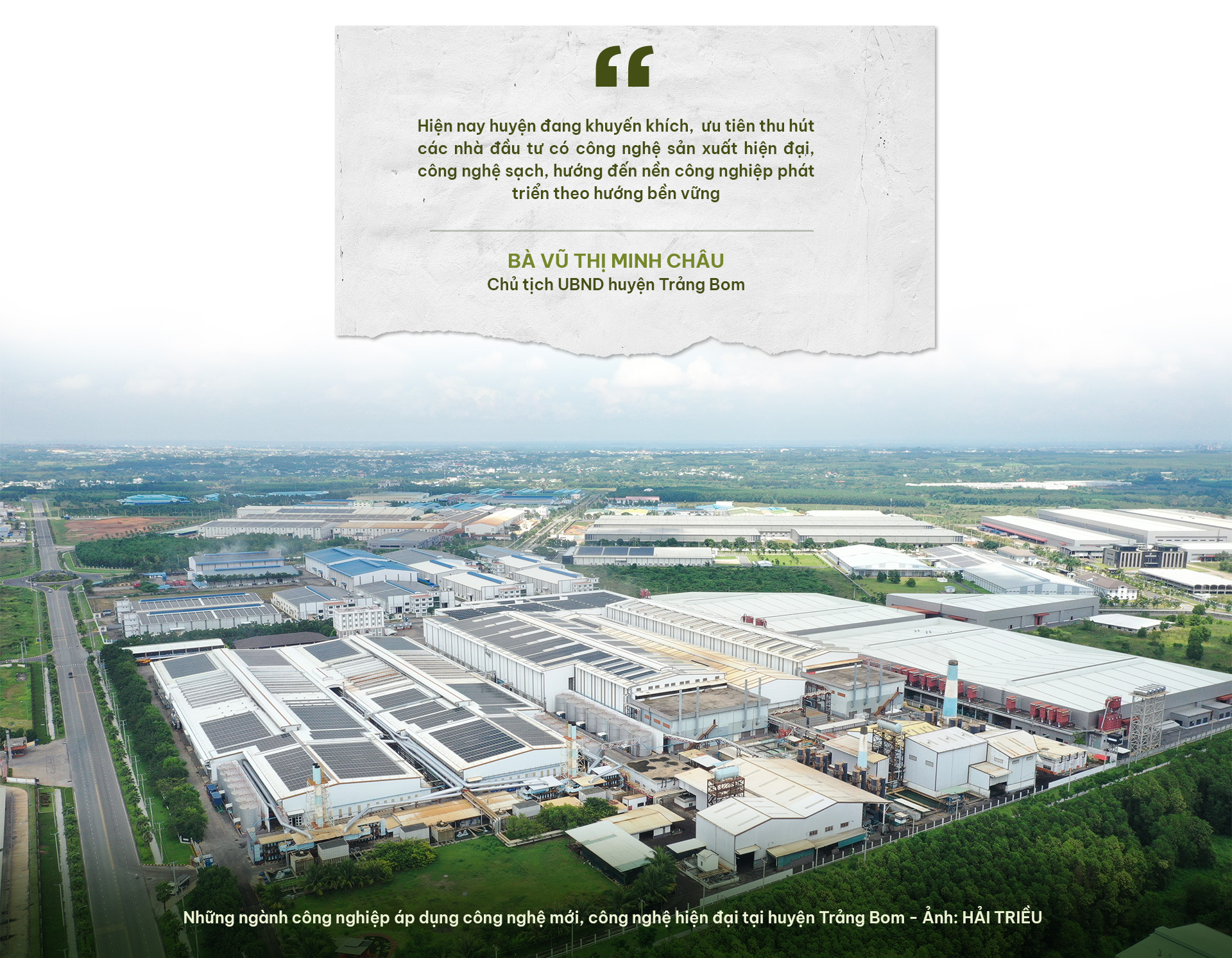 Bà Vũ Thị Minh Châu - chủ tịch UBND huyện Trảng Bom cho biết: "hiện nay huyện đang khuyến khích, ưu tiên thu hút các nhà đầu tư có công nghệ sản xuất hiện đại, công nghệ sạch, hướng đến nền công nghiệp phát triển theo hướng bền vững".