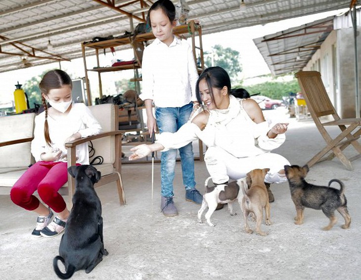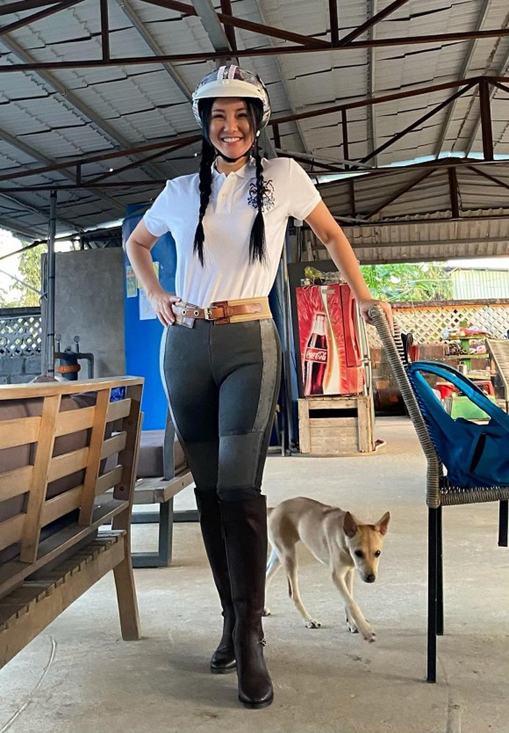 Hồng Nhung chia sẻ: "Khi cái thú "màn hình" đã là của mọi nhà, mẹ Bống cố gắng giữ thói quen hoạt động ngoài trời như tập cưỡi ngựa của ba mẹ con. Ở đây, Tôm & Tép học cách chăm sóc các em ngựa và một đàn chó...