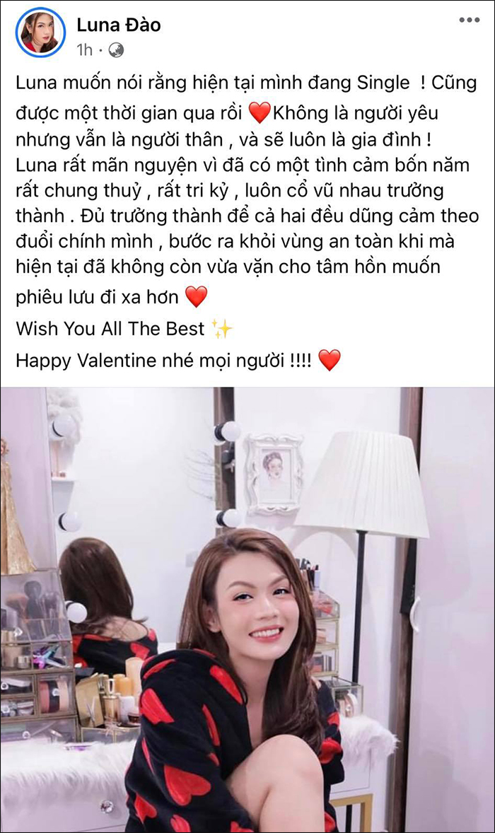 Trong dòng trạng thái mới đây, Luna Đào cho biết: "Luna muốn nói rằng hiện tại mình đang single (PV - độc thân) cũng được một thời gian qua rồi. Không là người yêu nhưng vẫn là người thân và sẽ luôn là gia đình. Luna rất mãn nguyện vì đã có một tình cảm 4 năm rất chung thủy, rất tri kỷ, luôn cổ vũ nhau trưởng thành. Đủ trưởng thành để cả hai đều dũng cảm theo đuổi chính mình, bước ra khỏi vùng an toàn khi mà hiện tại đã không còn vừa vặn cho tâm hồn muốn phiêu lưu đi xa hơn".