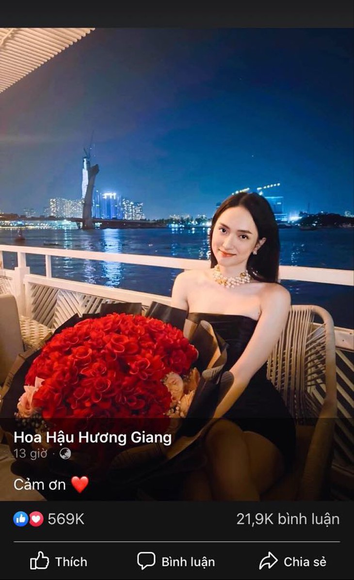 Dễ dàng nhận ra, hoa hậu chuyển giới và bạn trai đang có khoảng thời gian hạnh phúc vui vẻ bên nhau. Trên trang faceboob và IG, Hương Giang rạng rỡ ôm bó hoa đỏ thắm và đăng bức ảnh kỷ niệm ngày hạnh phúc của mình. Còn bạn trai CEO kém tuổi của người đẹp dành nhiều lời ngọt ngào, cũng như hứa hẹn về tương lai chung đôi. Cả hai khéo khoe hình chụp chung dưới phần bình luận.