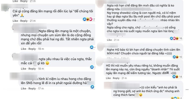 Một số khác dù không đồng tình với động tại khoe tình trạng yêu đương của cặp đôi, nhưng vẫn để lại những lời bênh vực trước thái độ gay gắt trên. Có ý kiến cho rằng, người trong showbiz cũng là con người, không phải lúc nào họ cũng có nghĩa vụ phải làm hài lòng tất cả…