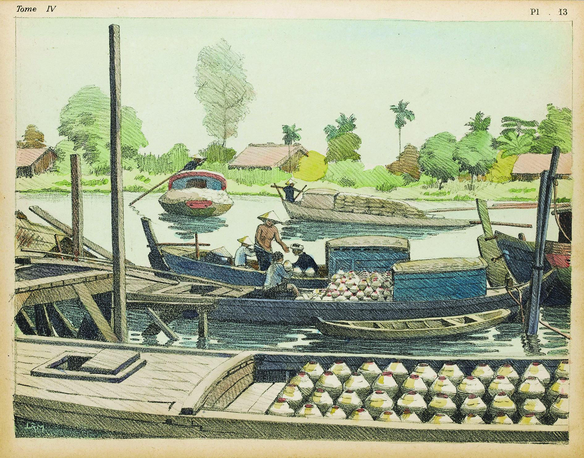 Vận chuyển nước mắm tĩn, tranh trong tập Chuyên khảo bằng tranh vẽ về Đông Dương : Nam Kỳ (Monographie dessinée de l'Indochine, Cochinchine) Tập 4 (1935). Nguồn: Flickr/manhhai
