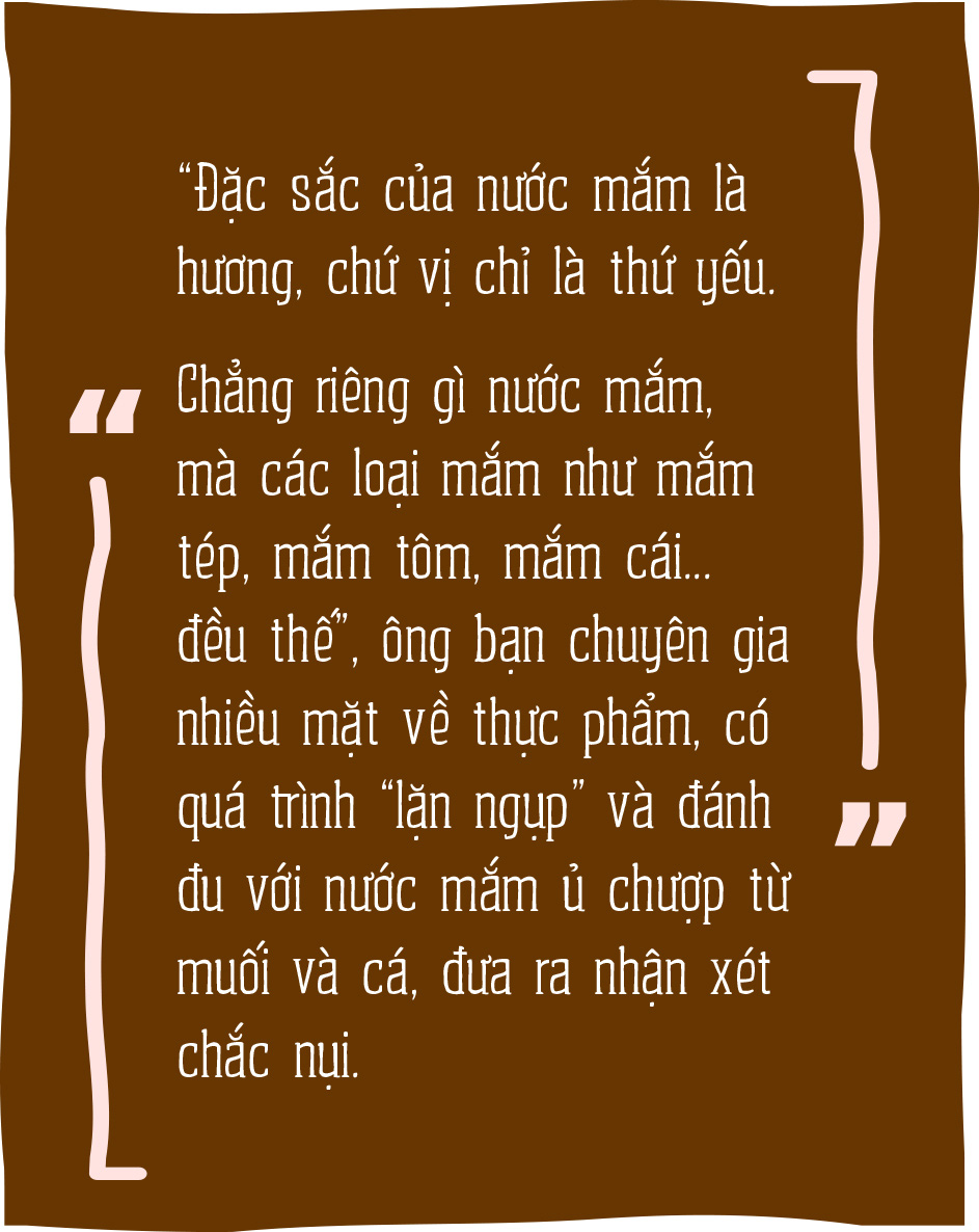 Tôi hỏi: vậy tại sao người ta không xây dựng tiêu chuẩn nước mắm ngon dựa trên hương và vị, mà chỉ dựa trên độ đạm, tức là vị. Trong khi theo ông, "độ đạm nước mắm càng cao, mùi nước mắm càng giảm".