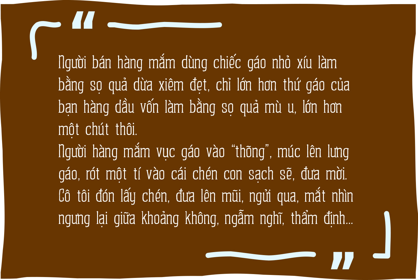 "(…) Ngày ấy, mỗi lần có gánh nước mắm bán dạo ghé vào nhà là cả một sự xôn xao. Bởi vì thường thường không một ai trong gia đình mà đủ tự tin vào tài nội trợ của mình để có thể một mình kiêu hãnh quyết định về giá trị một thứ nước mắm.