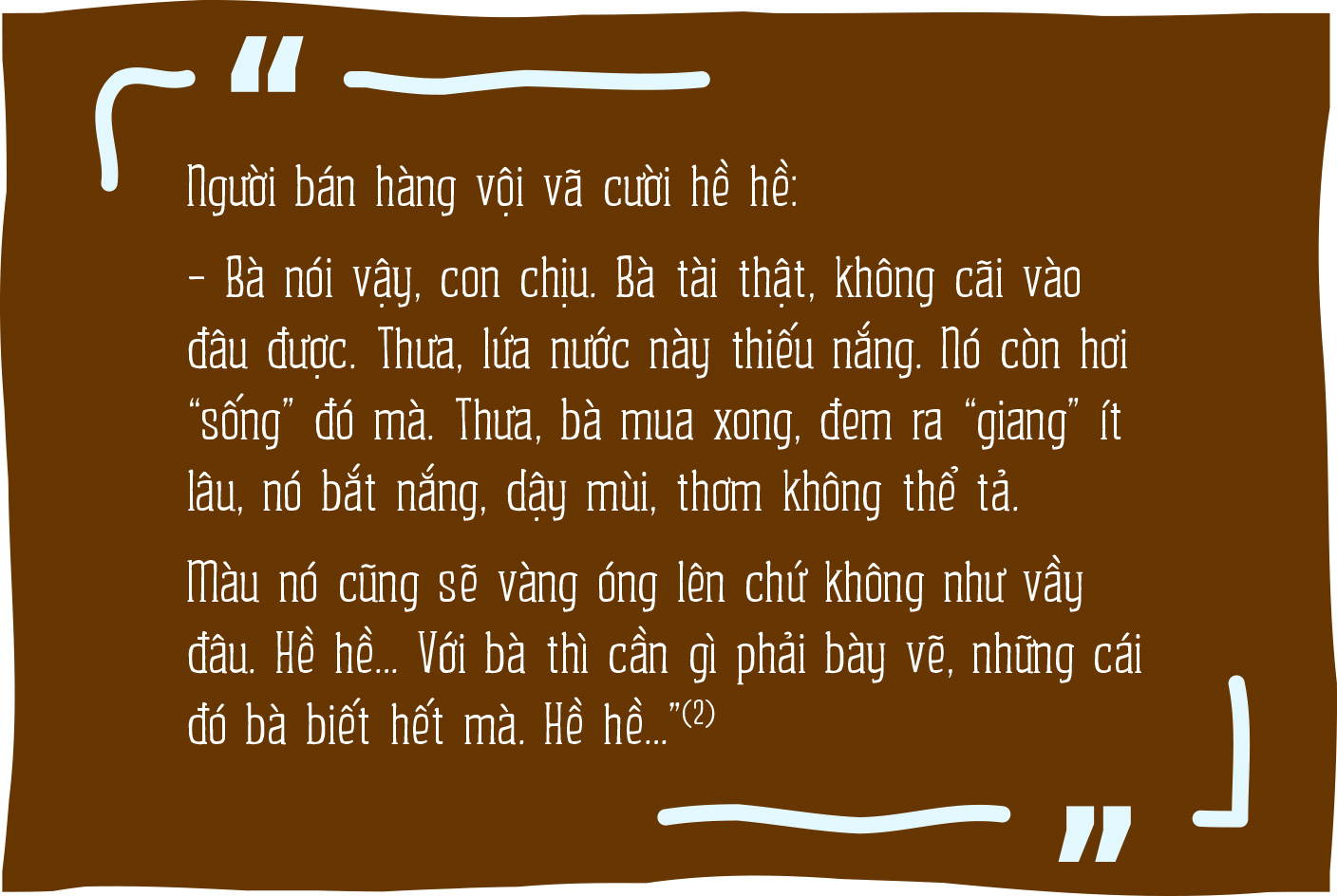 Bà tôi nhận định: - Nè, mấy đứa thấy sao? Cái màu kỳ này tao không vừa ý, mà mùi vị của nó cũng chưa đằm đâu.