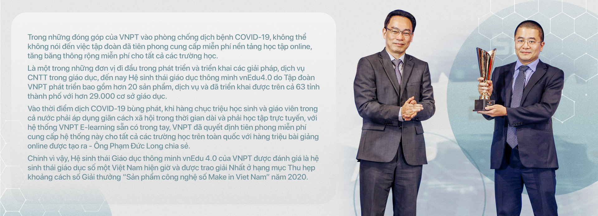 Đồng thời, VNPT đã kịp thời triển khai giải pháp VNPT E-Learning giúp hàng triệu giáo viên và học sinh "tạm dừng đến trường, không dừng học" và VNPT Meeting giúp các doanh nghiệp tiếp tục vận hành sản xuất kinh doanh…