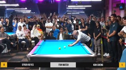 Huyền thoại Efren Reyes thực hiện pha đánh bi số 9 vào lỗ góc một cách khó tin, khiến người xem phải thốt lên: 'Đẳng cấp mới là mãi mãi!'.