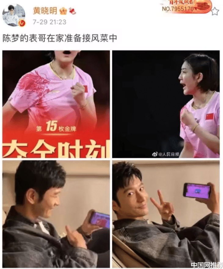 Bên cạnh đó, một số cư dân mạng cho rằng “Huỳnh Hiểu Minh rõ ràng là một fan hâm mộ "cứng" của nhà vô địch Olympic nên đã rất vui khi em họ Trần Mộng giành được huy chương vàng danh giá lần này.