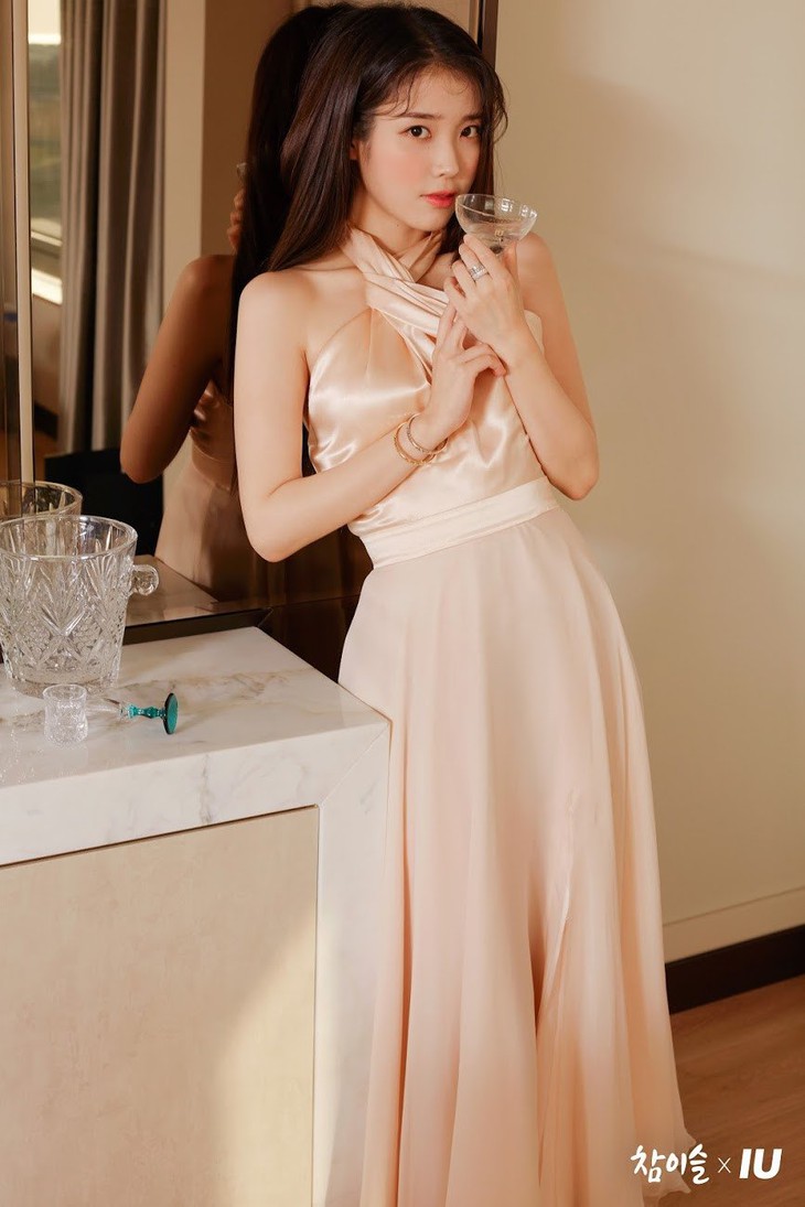 Trong chiếc váy satin sang trọng và trang điểm hơi nhấn nhá chút má hồng cộng thêm làn da trắng sáng, đôi mắt to tròn khiến IU vừa quyến rũ vừa đáng yêu.