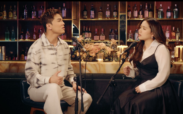 Hoàng Thắng - Minh Trâm (trái qua) mang tới liên khúc 'Biết nói gì đây - Chuyện ba người' với sự hỗ trợ của Khưu Huy Vũ - quán quân Tuyệt đỉnh song ca 2018 (phải).