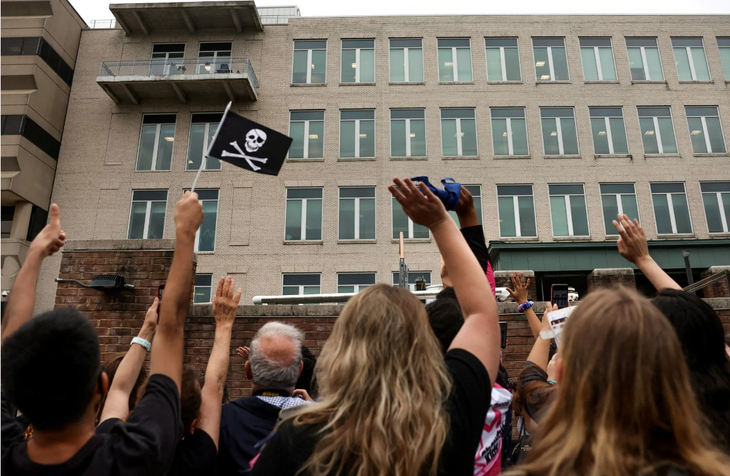Những người hâm mộ Johnny Depp vẫy tay hướng tới Tòa án Quận Fairfax sau khi nam diễn viên bước vào tòa nhà để xét xử tội phỉ báng đối với vợ cũ Amber Heard ở Fairfax, Virginia, vào tháng Năm. Ảnh: Reuters