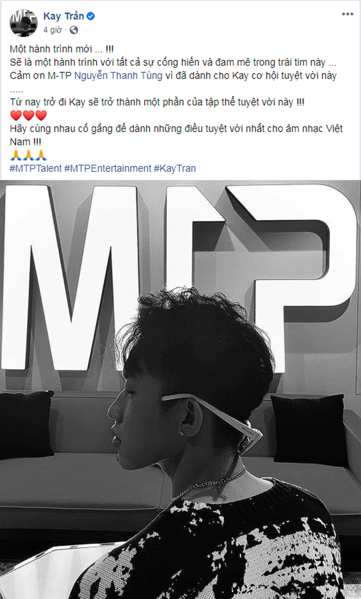 Thông báo của M-TP Talent khi Kay Trần trở thành nghệ sĩ độc quyền đầu tiên.M-TP Talent là công ty con trực thuộc M-TP Entertaiment, được Sơn Tùng M-TP công bố cách đây 2 ngày. Nam nghệ sĩ đã chính thức cho ra mắt fanpage của M-TP Talent vào tối 22-7.