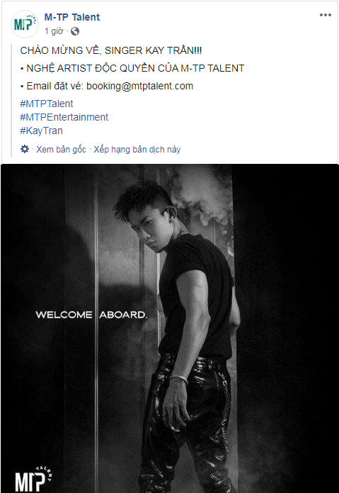 Cụ thể, fanpage của M-TP Talent đã ghi những dòng đơn giản, xác nhận việc Kay Trần gia nhập công ty: “Chào mừng về, singer Kay Trần. Nghệ sĩ artist độc quyền của M-TP Talent”. Kèm với đó là hình ảnh của nam nghệ sĩ.