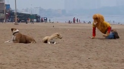 Người đàn ông vừa bước vào đến sân bị một phen hú hồn hú vía khi hai con chó dữ lao ra. May mắn, gia chủ kịp chạy tới để xua đuổi chúng.