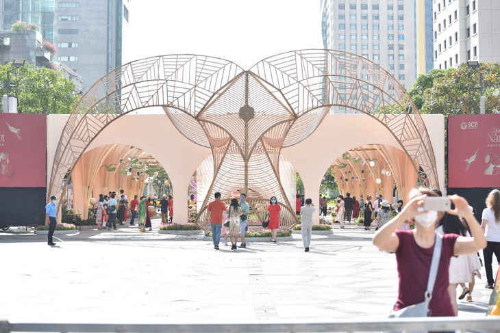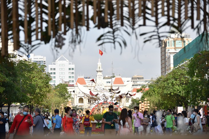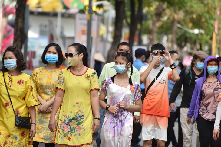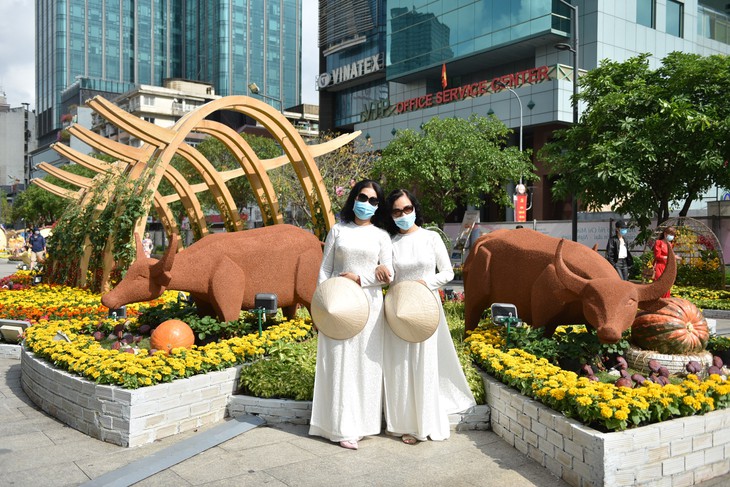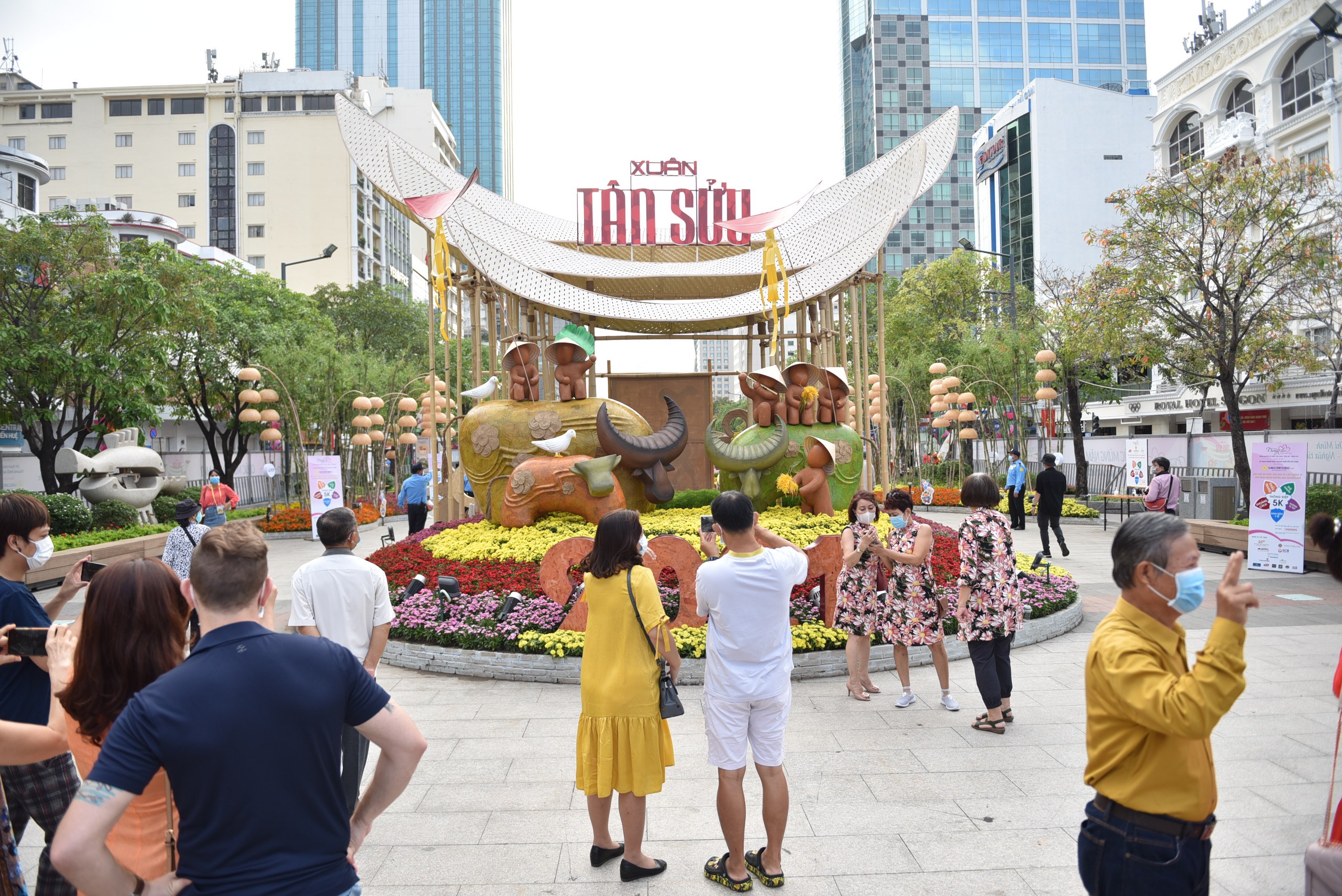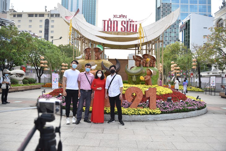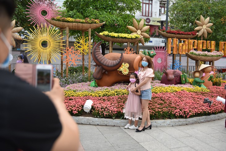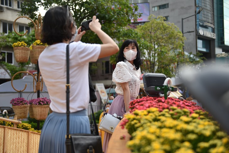 Khách tham quan đường hoa Nguyễn Huệ selfie cùng... khẩu trang