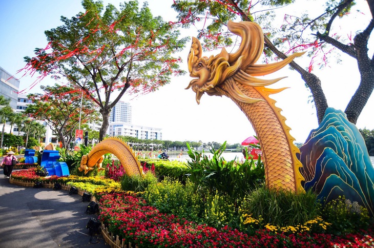 Nhiều người đến tham quan hứng thú với linh vật rồng xuất hiện ở khu vực đầu đường hoa.