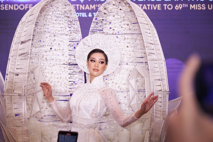 Nhà thiết kế Khoa Lỗ cho biết Kén Em nặng gần 30 ký, nên sau khi bàn bạc thống nhất với Khánh Vân, ê-kíp quyết định chỉnh sửa lại phần khung quanh kén để giảm tải sức nặng cho phần vai và cơ tay.