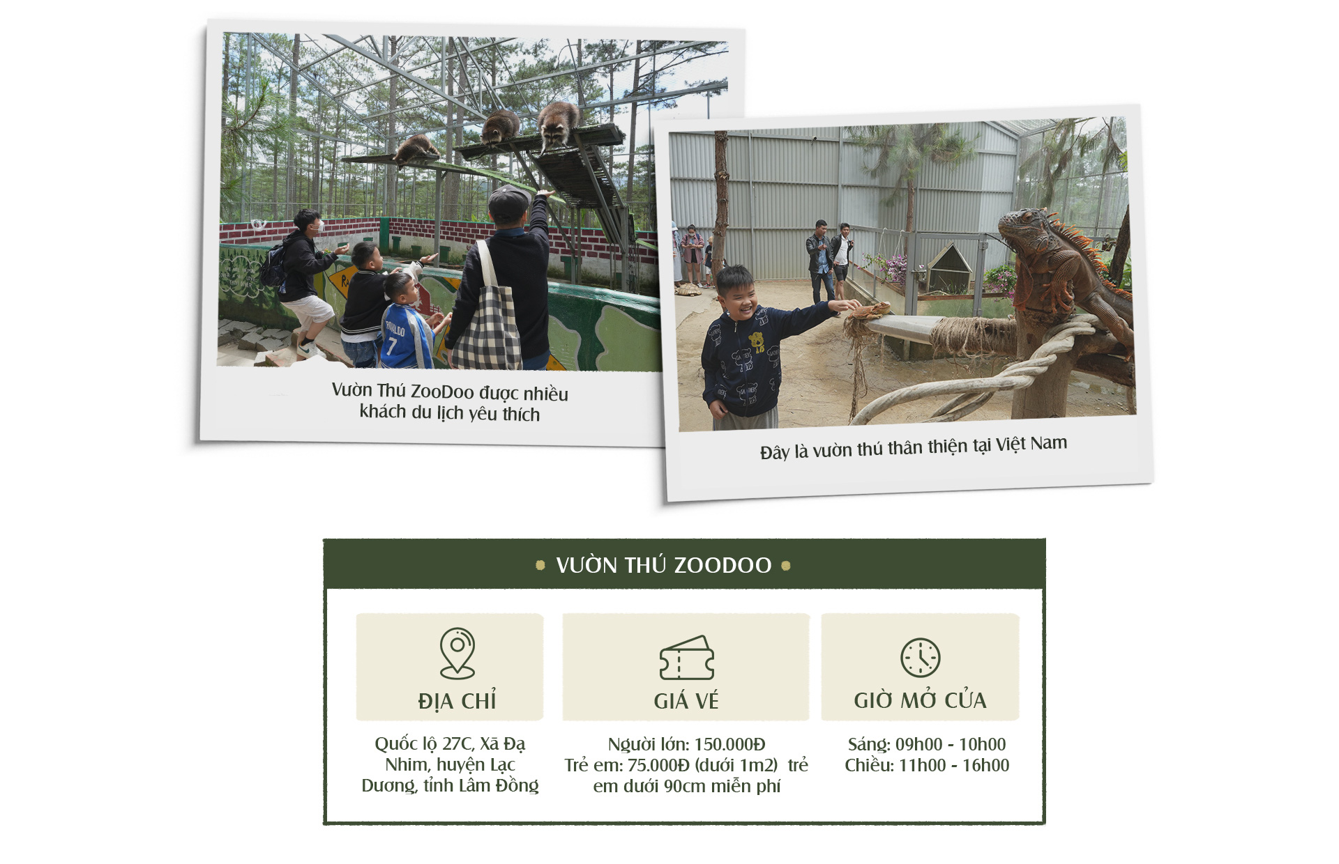 Diện tích khu vực vườn thú rộng khoảng 2ha, một chuyến tham quan cùng hướng dẫn viên sẽ kéo dài 45 phút. Khi đến thăm vườn thú Zoodoo, du khách sẽ được thỏa sức vui chơi, chụp ảnh cùng thiên nhiên và những loài thú. Bên cạnh đó, du khách còn có thể cho các bạn thú ăn bằng thức ăn của Zoodoo dưới sự hướng dẫn của nhân viên chăm sóc thú.