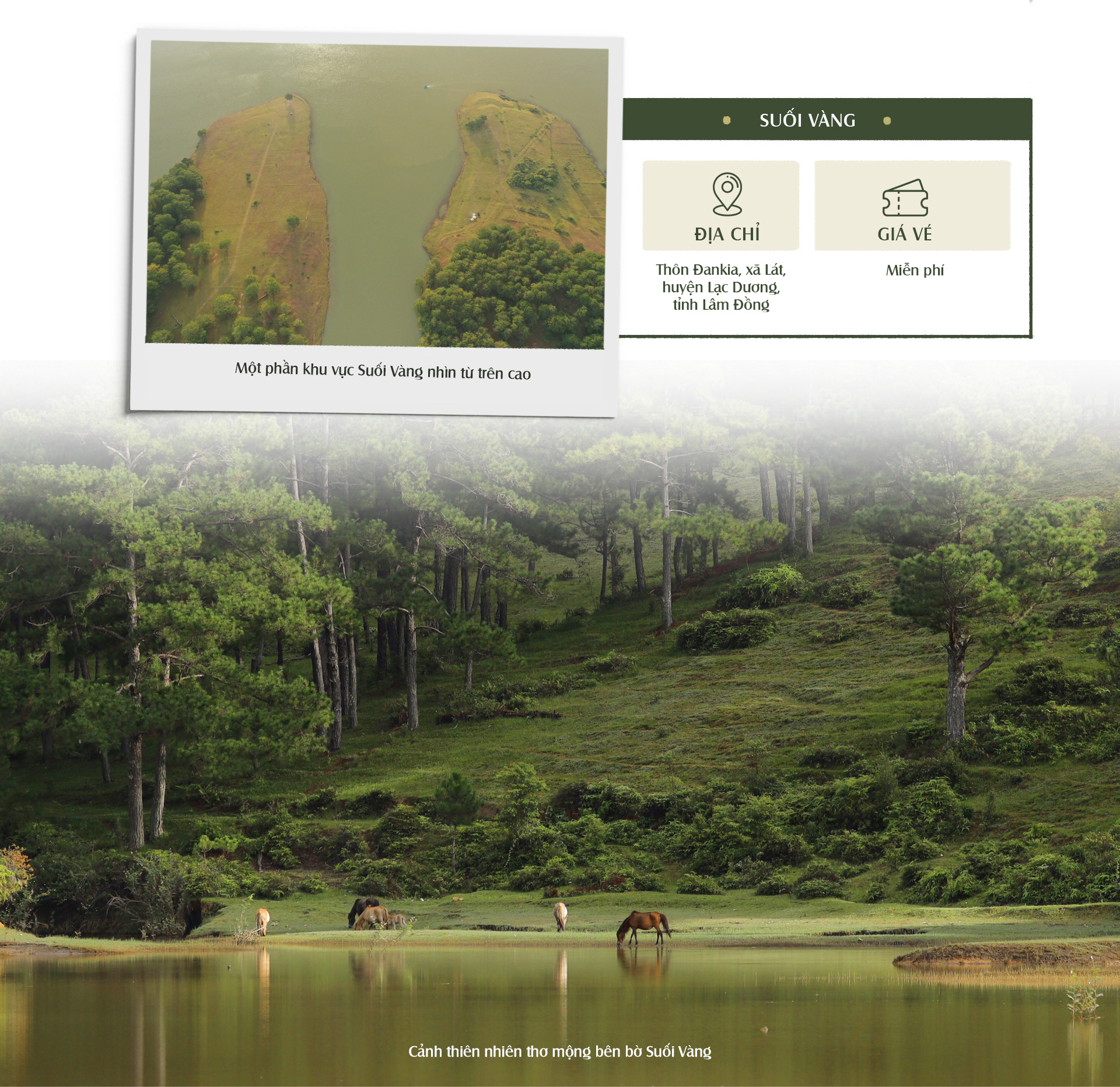 Suối Vàng tọa lạc cách trung tâm thành phố Đà Lạt khoảng 17km về hướng Tây Bắc. Suối Vàng là một trong những địa điểm được du khách lui tới nhiều nhất tại thành phố mộng mơ. Suối Vàng có sự kết hợp hài hòa, hoàn hảo của vẻ đẹp núi rừng bao la. Ôm lấy hồ còn có những ngon đồi kỳ vỹ, thơ mộng.