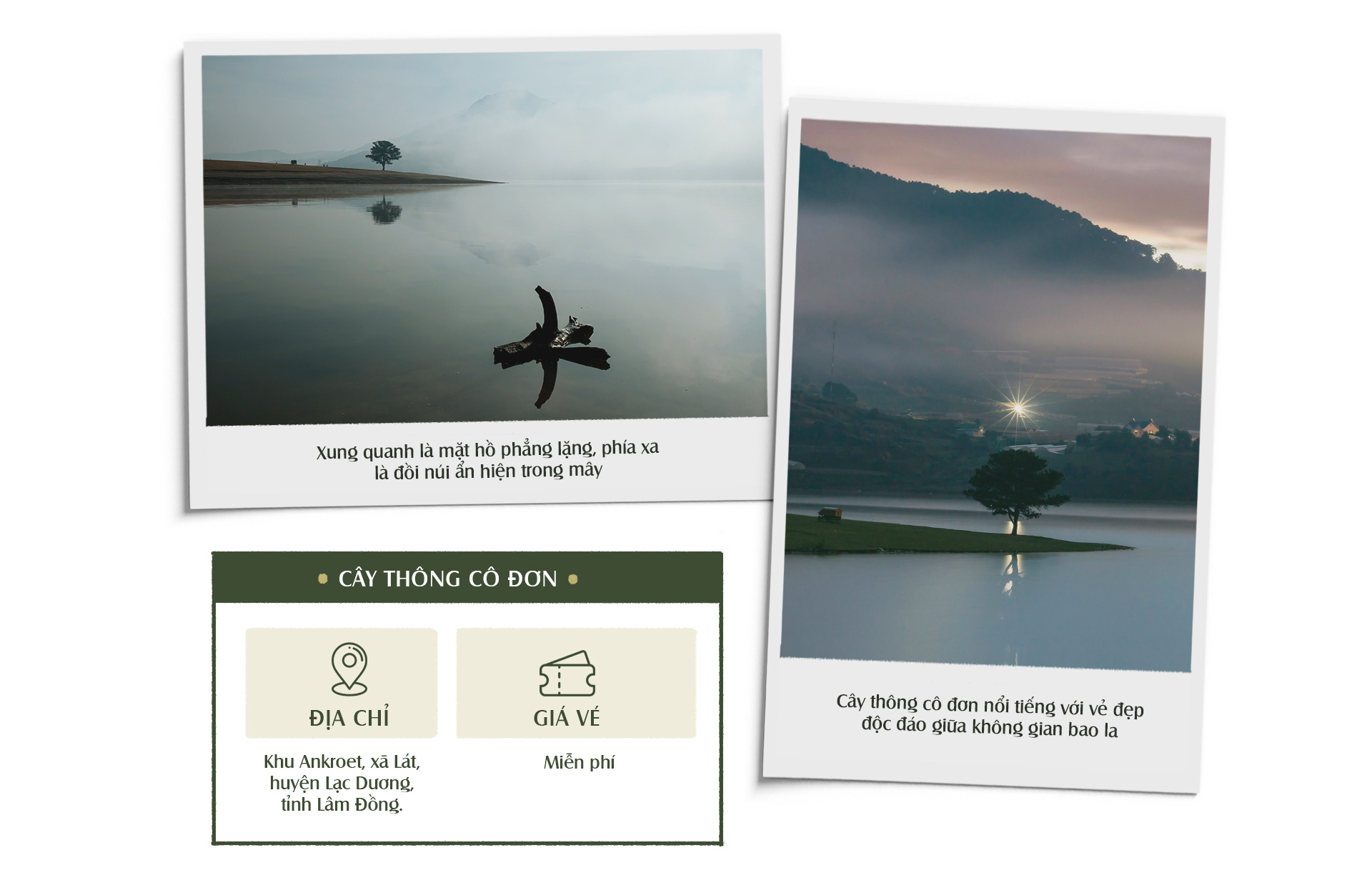 Cây thông cô đơn không chỉ nổi tiếng vì cái tên mà còn vì danh lam thắng cảnh ở đây rất đẹp và yên bình. Xung quanh là mặt hồ phẳng lặng, phía xa xa là những quả đồi trập trùng ẩn hiện trong mây , thảm cỏ căng tràn sức sống. Để đến được đây du khách sẽ băng qua những con đường khúc khuỷu, hòa mình vào chốn tiên cảnh, tận hưởng không khí se se lạnh bên người thân và bạn bè.