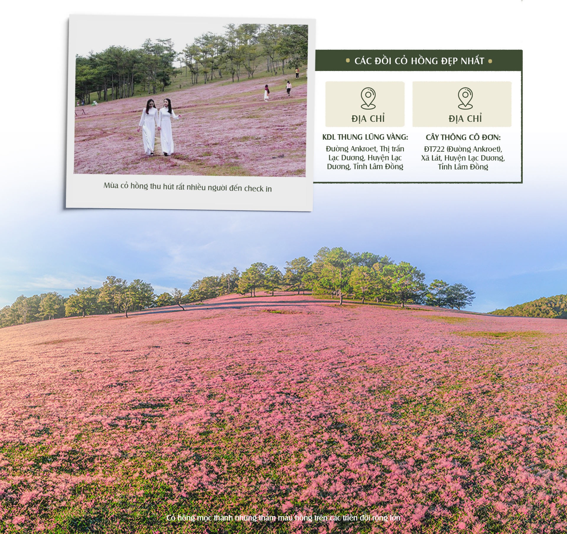 Cỏ hồng là cách gọi của một loại cỏ dại mọc thành từng bụi nhỏ trên mặt đất. Chúng mọc thành những thảm màu hồng trên các triền đồi rộng lớn và chỉ xuất hiện một lần trong năm. Đồi cỏ hồng Đà Lạt thường xuất hiện từ giữa tháng 11 đến tháng 12 hằng năm, ở dưới chân đồi thông nên tạo thành một khung cảnh vô cùng lãng mạn. Khi check-in đồi cỏ hồng, chắc chắn du khách sẽ có những bức ảnh độc đáo và đặc sắc.