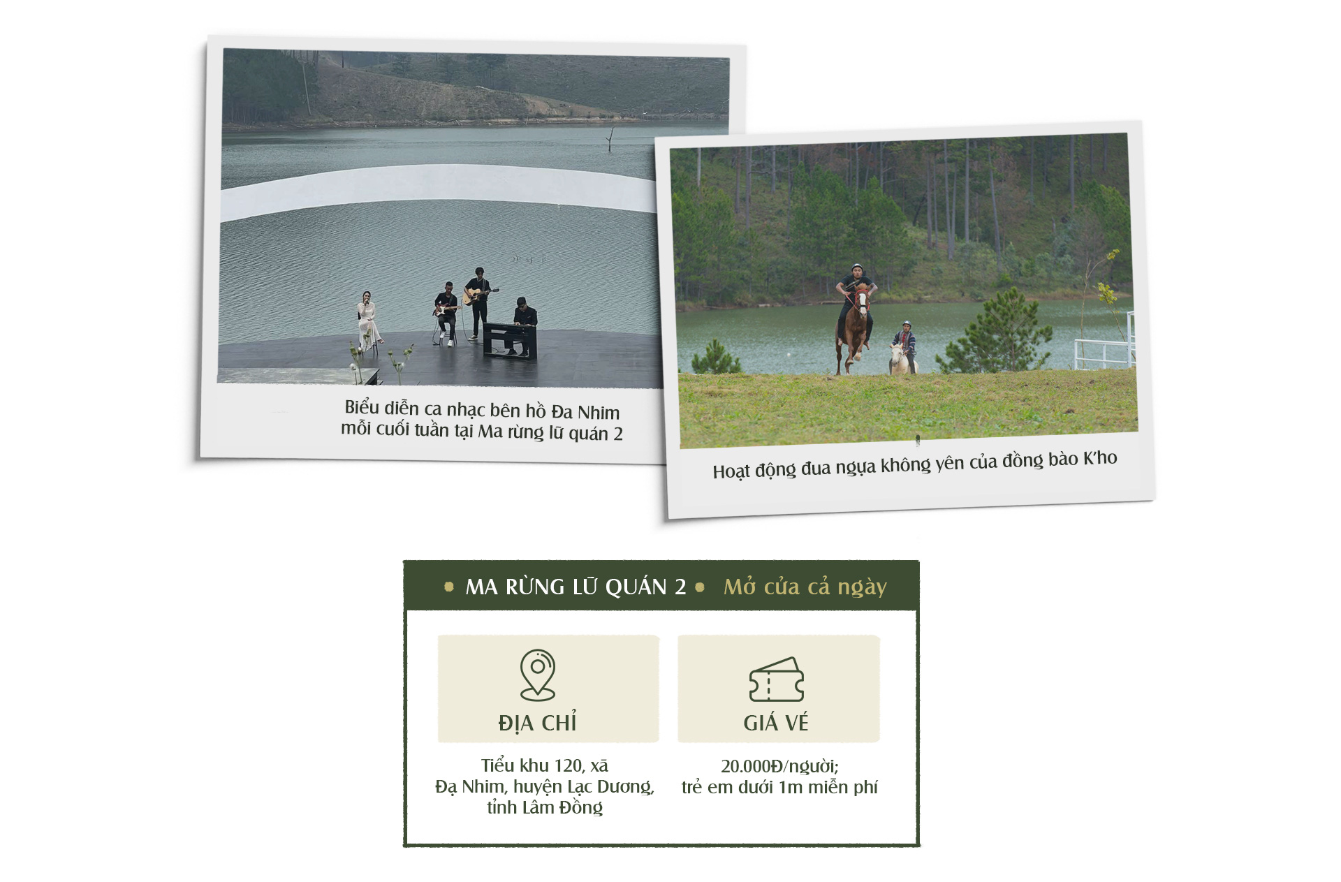 Được bao bọc trong khung cảnh núi đồi hùng vĩ, băng qua những cánh rừng thông, những triền đồi quanh co và thung lũng nối dài, Khu du lịch Ma Rừng Lữ Quán 2 nằm trên địa phận xã Đạ Nhim, huyện Lạc Dương cách Đà Lạt khoảng 30 phút đi xe máy. Đây là khu du lịch mang đậm màu sắc thiên nhiên và bản sắc dân tộc, mang đến những trải nghiệm mới lạ, giải trí và thư giãn. Trong trẻo, chân thật, tươi mới là những tính từ dùng để miêu tả cho nguồn năng lượng ở vùng đất này.