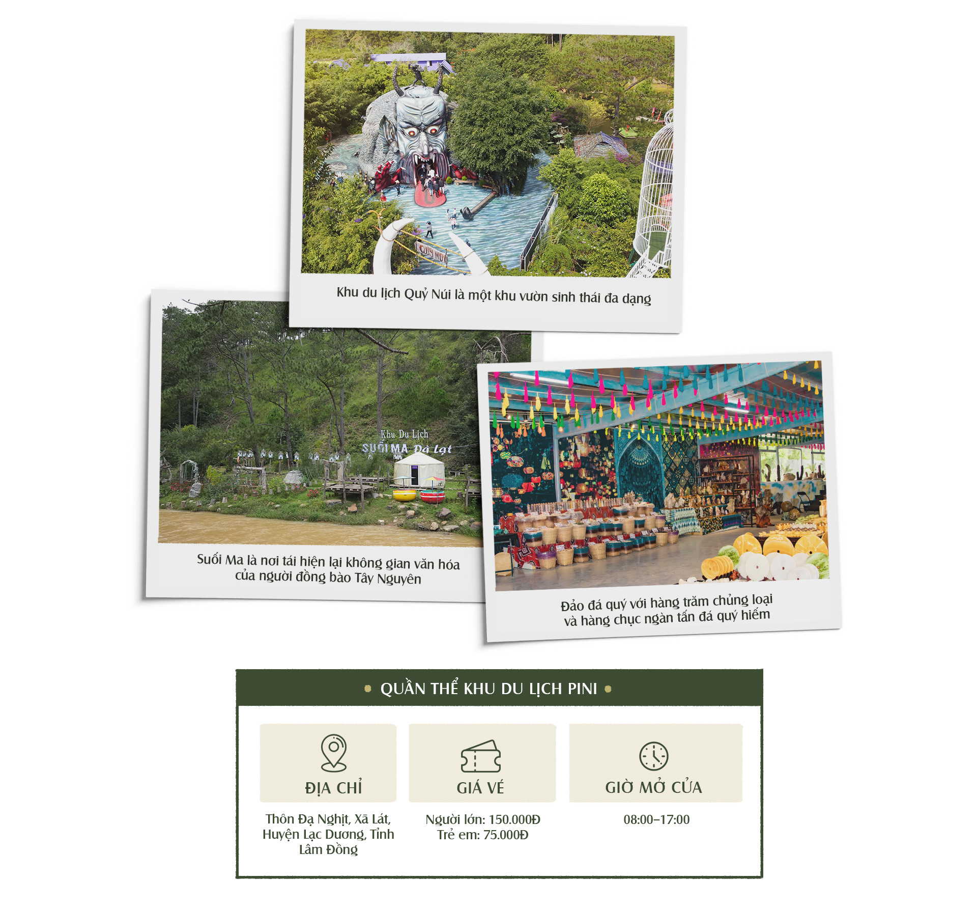 Quần thể Khu du lịch PiNi được thiết kế theo công trình quái trúc, là một khu vườn sinh thái , bảo tồn rất nhiều loại cá nước ngọt như: cá nước lạnh, cá sấu hỏa tiễn, cá thần, cá bạch tạng… và thảm thực vật vô cùng phong phú. Nơi đây lưu giữ khoảng 5.000 đơn vị cổ vật của người đồng bào xưa. Điểm du lịch Suối Ma bên trong quần thể là nơi tái hiện lại không gian văn hóa qua một ngôi làng nhỏ với cuộc sống đời thường và các tín ngưỡng, lễ hội đặc sắc của đồng bào dân tộc K’Ho. Bên cạnh đó, những minishow diễn tả lại hành trình chinh phục thiên nhiên của người dân Tây Nguyên sẽ là điểm dừng chân cho du khách trong quá trình khám phá những cảnh quan tại đây.