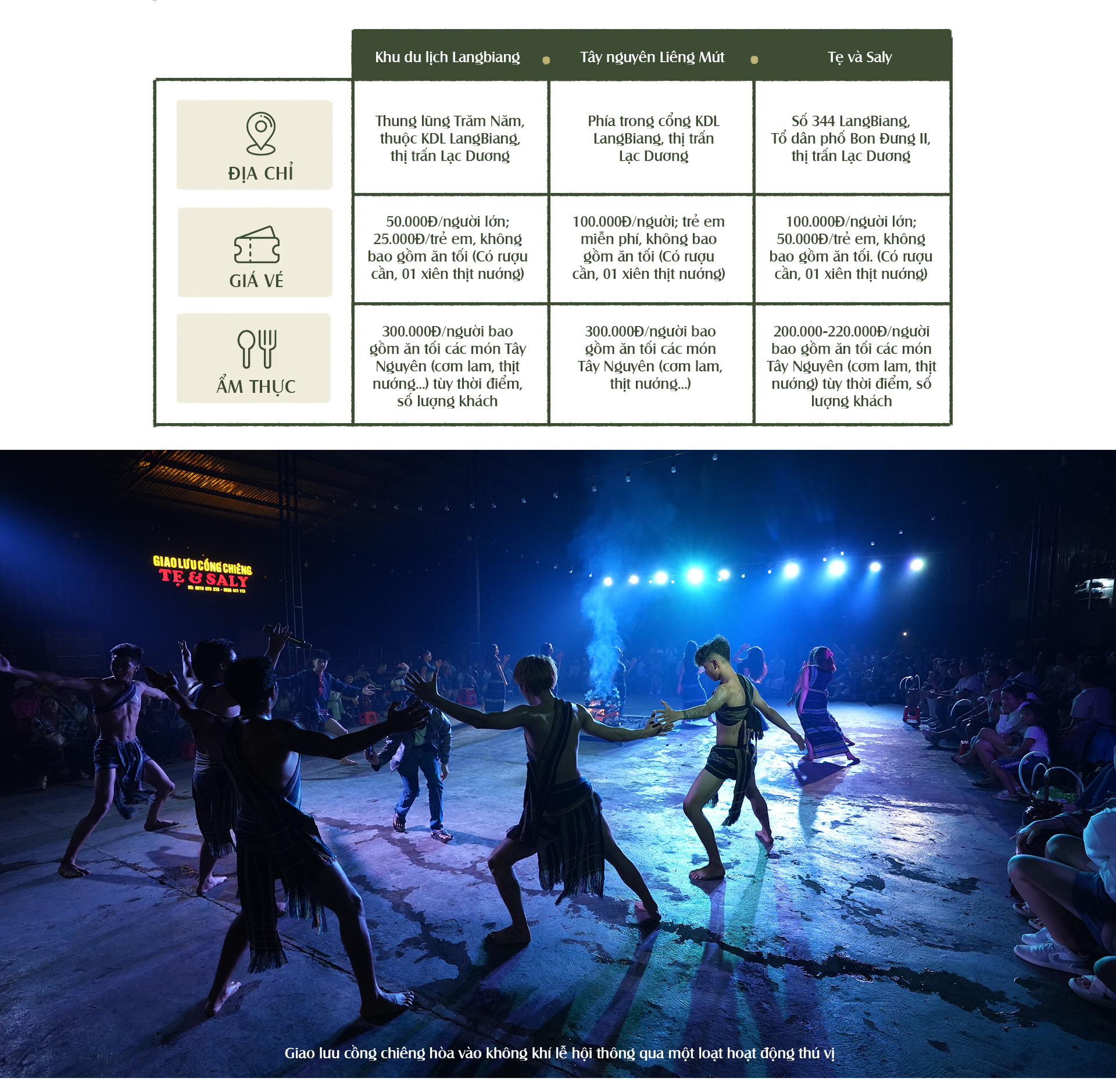 Gợi ý các điểm giao lưu cồng chiêng (phục vụ khách từ 17 đến 18h30 hoặc 19h đến 20h30):
