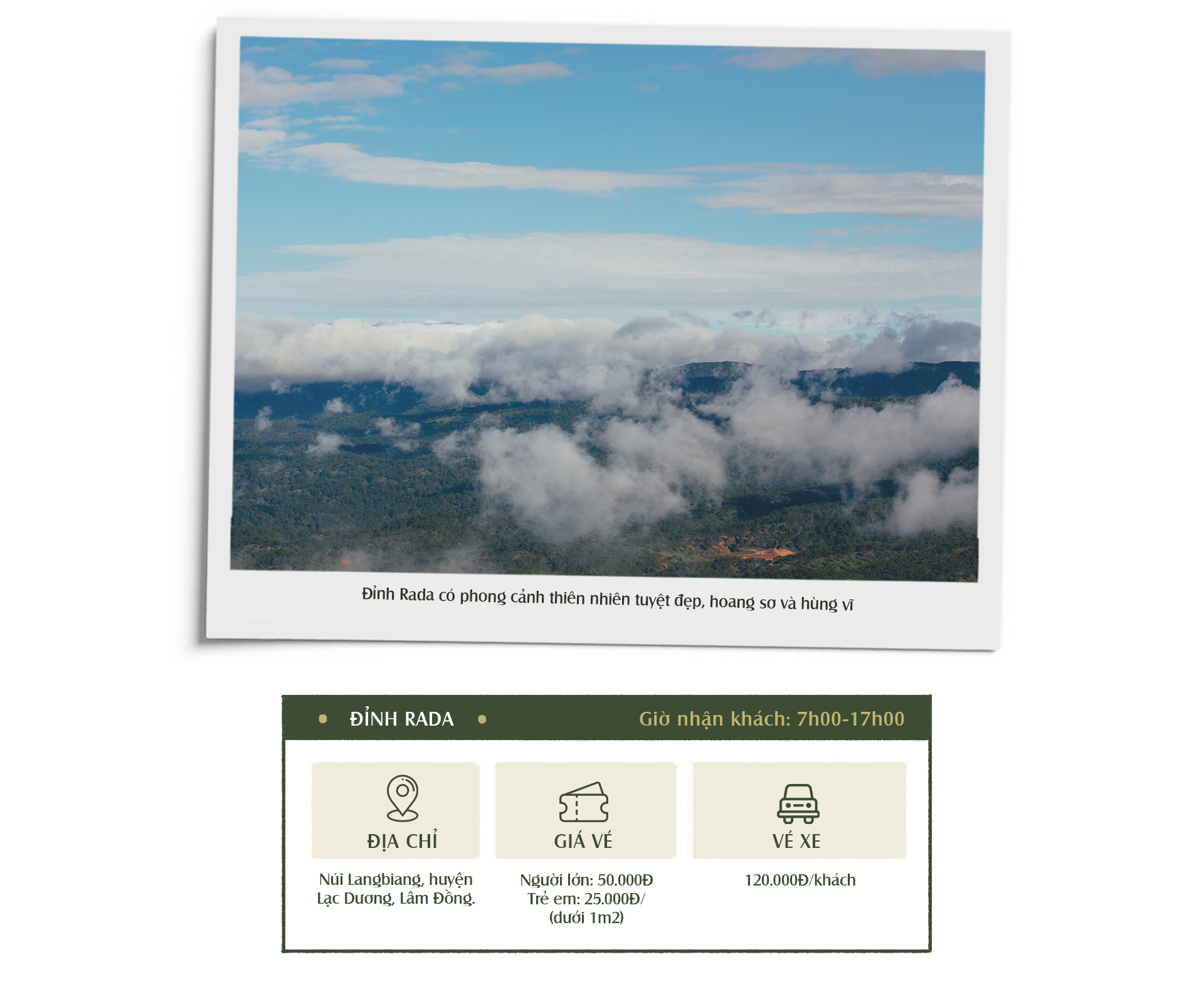 Đỉnh Rada là một trong số những ngọn núi thuộc dãy LangBiang huyền thoại, có phong cảnh thiên nhiên tuyệt đẹp, hoang sơ và hùng vĩ . Đứng từ trên cao, bạn có thể dễ dàng ngắm nhìn cả thành phố Đà Lạt thu nhỏ trước mắt. Bởi vì thuộc dãy LangBiang nên đỉnh Rada thường bị nhầm là đỉnh núi LangBiang. Tuy nhiên hai đỉnh núi này thực tế lại khác nhau và mang vẻ đẹp riêng không hòa lẫn.