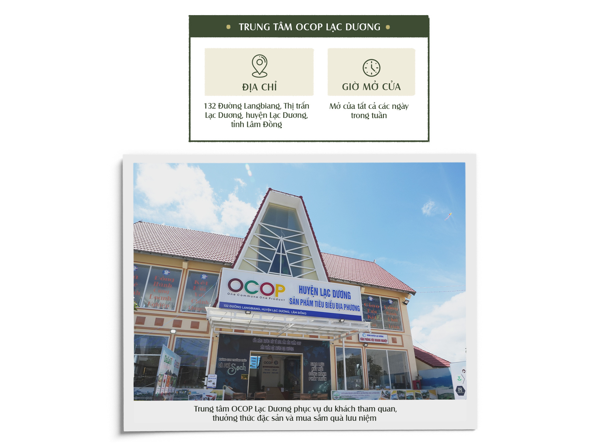 Tại Trung tâm giới thiệu sản phẩm OCOP của huyện Lạc Dương du khách có thể đến tham quan, thưởng thức đặc sản và mua sắm quà lưu niệm. Những sản phẩm OCOP của huyện đều mang đặc trưng về văn hóa, lịch sử, truyền thống và con người địa phương. Các sản phẩm điển hình như cà phê, phúc bồn tử, dâu tây, nấm đông trùng hạ thảo, actiso, trà và các loại rượu…