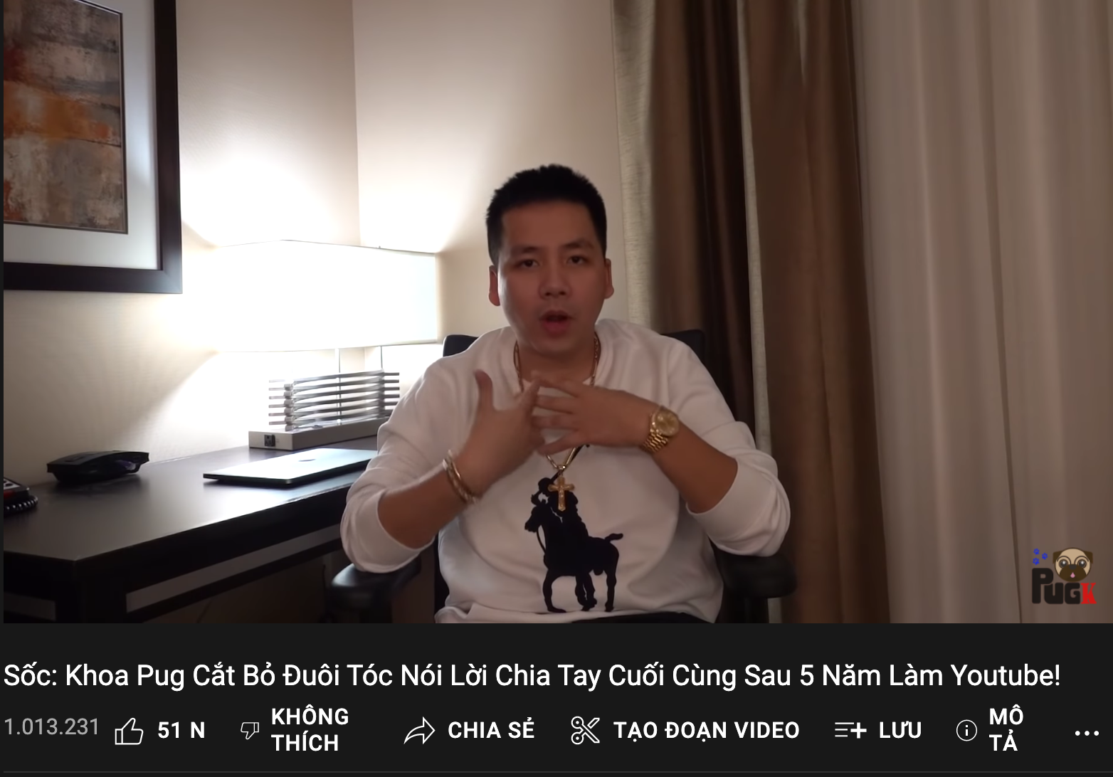 Mới đây, Khoa Pug đã đăng tải đoạn clip chia sẻ thông tin chính thức giải nghệ sau hơn 5 năm làm YouTube. Video nhanh chóng thu hút hơn 1 triệu lượt xem chỉ trong chưa đầy 12 tiếng.