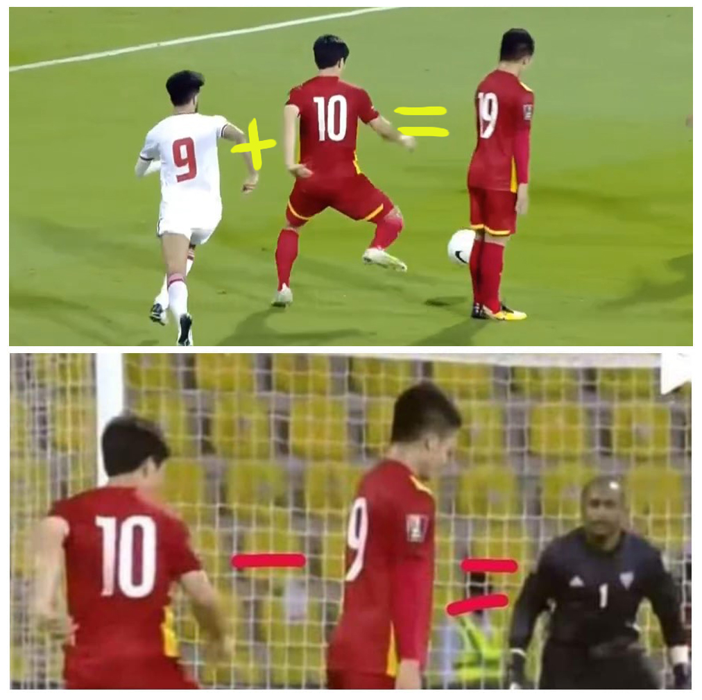 Giữa muôn vàn khoảnh khắc cuốn hút của trận đấu, hình ảnh Quang Hải "đứng hình" khi Công Phượng đang vào pha tranh chấp bóng, lại đem đến hàng loạt tràng cười từ dân mạng. Chẳng hiểu "trời xui đất khiến" thế nào mà số áo trên người của các cầu thủ đang có trong khung hình đã "vô tình" tạo thành hai phép toán: "9 + 10 = 19" và "10 - 9 = 1".