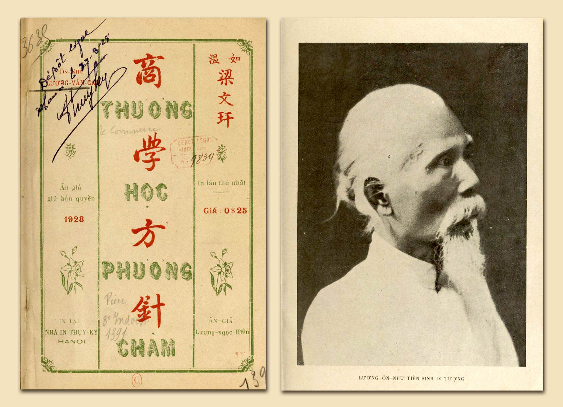 Bìa sách Thương học phương châm (xuất bản năm 1928) và ảnh của Lương Văn Can trong sách. Tư liệu Thư viện Quốc gia.