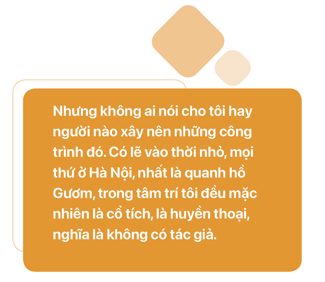 Tôi lớn lên với sự chấp nhận tính vô danh của chủ thể sáng tạo ra những giá trị văn hóa truyền thống của Hà Nội, tựa như sống với màn sương huyền thoại là một lẽ đương nhiên. Luôn có một niềm tự hào ngấm ngầm về sự xa xưa, một khoảng mờ mờ hư ảo của quá khứ vàng son trong cách nói về giá trị của Hà Nội.