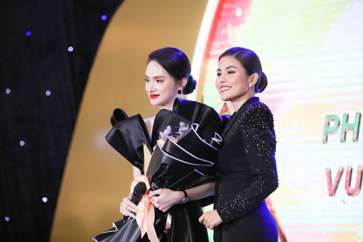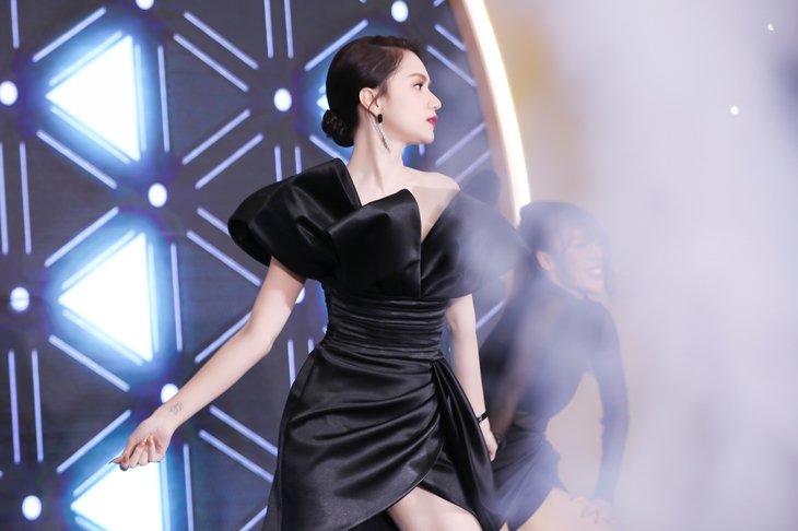 Cũng tại sân khấu này, hoa hậu chuyển giới - ca sĩ Hương Giang cũng không kém cạnh khi xuất hiện trong thiết kế đầm đen sẻ xâu hun hút. Người đẹp trình diễn lại liên khúc từng làm nên tên tuổi của mình như: Tặng anh cho cô ấy, Em hơi mệt với bạn thân anh…