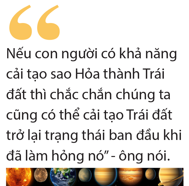 Ông cho rằng nỗ lực để làm điều này sẽ dễ dàng hơn nhiều so với việc cải tạo sao Hỏa và sau đó vận chuyển hàng tỉ người đến đó.