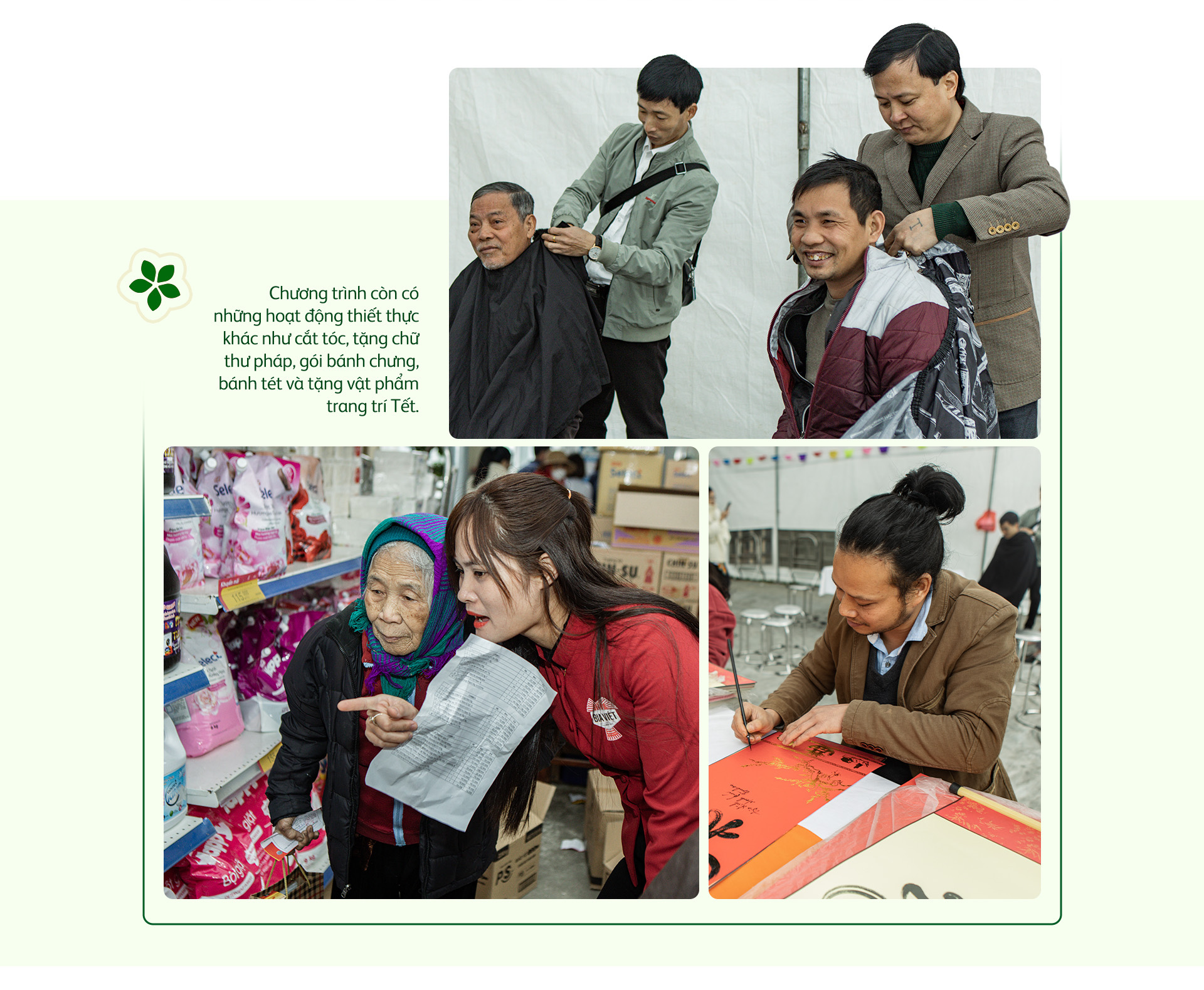 Ngoài ra, chương trình còn có những hoạt động thiết thực khác như cắt tóc, tặng chữ thư pháp, gói bánh chưng, bánh tét và tặng vật phẩm trang trí Tết.