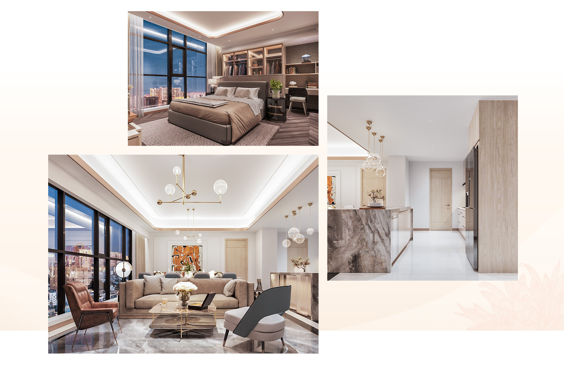 Điểm nhấn khác tại căn hộ chính là tầm view. Trong không gian riêng tư của căn hộ, mỗi khung cửa lớn không chỉ đón ánh sáng tự nhiên, mà còn mở ra những tầm nhìn tuyệt đẹp về cảnh quan thành phố. Tầm nhìn toàn cảnh, không bị che chắn bởi bất cứ công trình lớn nào.