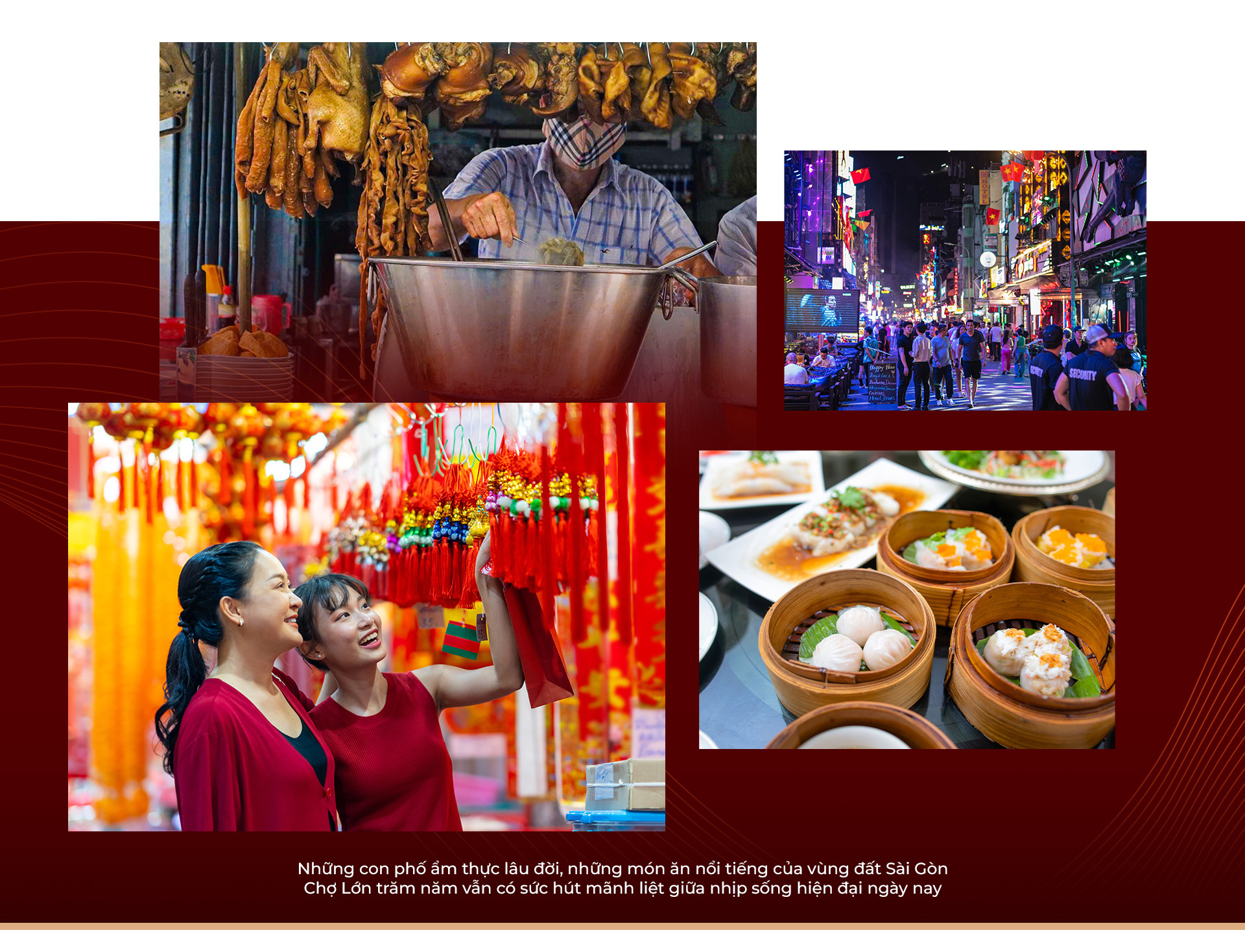 Nơi ta thường bắt gặp những khuôn mặt dù lạ nhưng rạng rỡ nụ cười thân thiện kèm giọng nói nhẹ nhàng đầy hào sảng đậm chất Sài Gòn hòa giữa không gian phố Hoa phảng phất hương ẩm thực của cơm chiên Dương Châu, đậu hủ Tứ Xuyên, heo quay, vịt quay, chè hột gà... nổi tiếng suốt trăm năm.