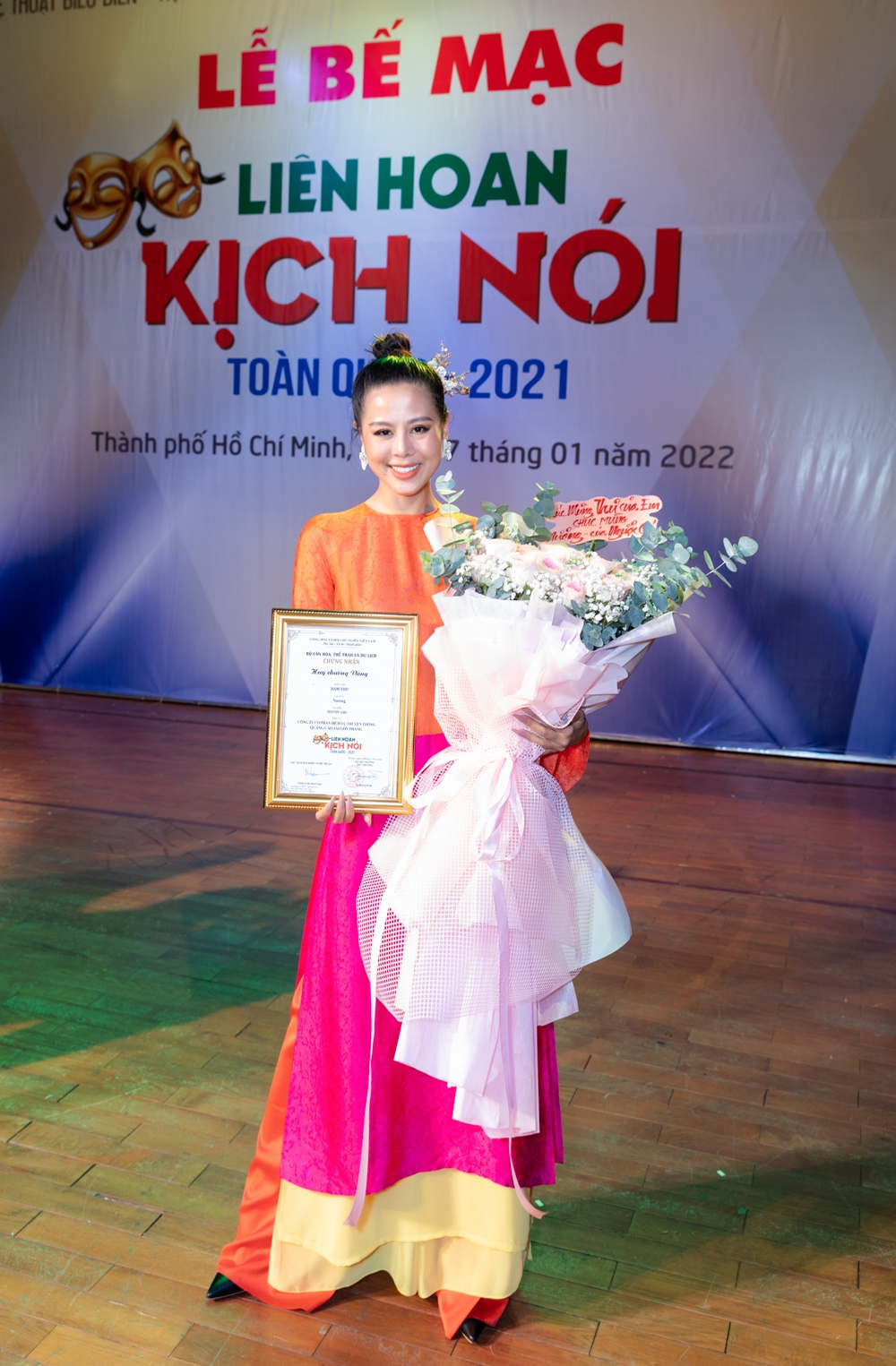 Nam Thư đằm thắm trong ngày nhận Huy chương vàng tại Liên hoan sân khấu kịch toàn quốc. Khác với hình ảnh nóng bỏng, quyến rũ thường thấy, nữ diễn viên chọn cho mình chiếc áo dài đến từ nhà thiết kế Thủy Nguyễn. Dẫu vậy, bộ trang phục được cách điệu nhiều màu sắc kết hợp cùng kiểu tóc búi cao này cũng giúp Nam Thư trở nên nổi bật hơn.