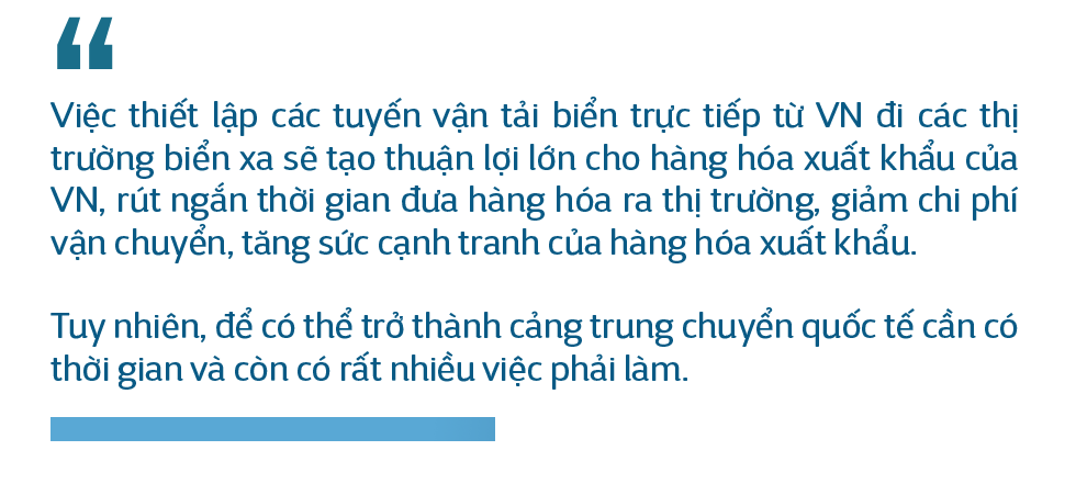 - Hoạt động trung chuyển hàng hóa nói chung, đặc biệt là trung chuyển hàng container, trở thành xu hướng tất yếu của vận tải biển toàn cầu. Trong bối cảnh đội tàu vận tải biển thế giới ngày càng gia tăng về kích cỡ và tải trọng để tiết giảm chi phí, việc hình thành những đầu mối chuyển tải lớn là dễ hiểu. Hiện hoạt động trung chuyển container chiếm khoảng 30% tổng khối lượng container vận tải biển toàn cầu. Khu vực Đông Nam Á, vùng Viễn Đông, Trung Đông, Mỹ Latin, Bắc và Nam Âu là những vùng địa lý năng động nhất, nơi diễn ra các hoạt động trung chuyển rất nhộn nhịp. Đặc biệt, khu vực Đông Nam Á và Đông Á (Viễn Đông) luôn là vùng có khối lượng container trung chuyển lớn nhất thế giới, gắn liền với các tuyến vận tải qua Biển Đông của VN.