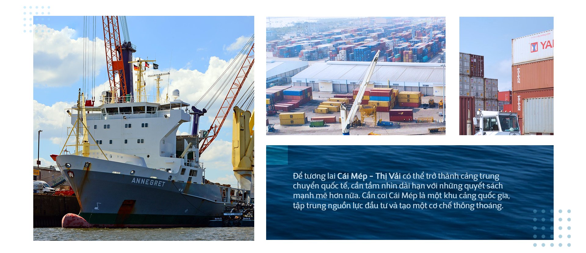 Để thực hiện mục tiêu này, Nhà nước đã đầu tư và hình thành khu cảng Cái Mép - Thị Vải với các bến cảng được xây dựng quy mô và trang thiết bị bốc xếp hiện đại. Mạng lưới cơ sở hạ tầng kết nối và các tiện ích phục vụ cho hoạt động cảng biển đang từng bước được đầu tư. Các bến cảng tại Cái Mép - Thị Vải đủ năng lực tiếp nhận thế hệ siêu tàu container sức chở 18.000 - 20.000 TEU với trọng tải đến 200.000 DWT (deadweight tonnage - trọng tải toàn phần - đơn vị đo tổng năng lực vận tải an toàn của một tàu thủy tính bằng tấn chiều dài, không phải trọng lượng tàu hay trọng lượng hàng hóa trên tàu), là thế hệ tàu container có trọng tải lớn nhất thế giới hiện nay. Hiện tại, hàng tuần có khoảng 26 tuyến vận tải container từ Cái Mép - Thị Vải trực tiếp đến các thị trường xuất nhập khẩu lớn của chúng ta, trong đó có 13 tuyến đi Mỹ, 3 tuyến đi châu Âu, 1 tuyến đi châu Phi và 9 tuyến nội Á và Trung Đông.