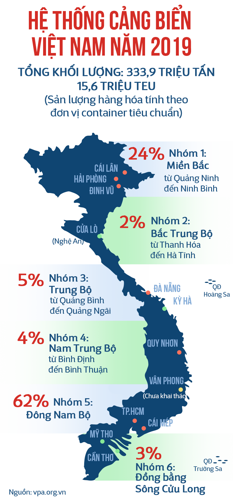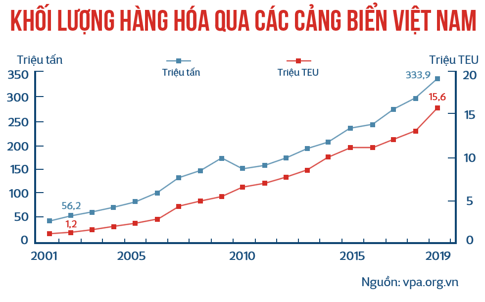 Hệ thống cảng biển Việt Nam hiện có 286 bến với tổng chiều dài khoảng 82.800m cầu cảng, công suất thiết kế khoảng 600 triệu tấn. Hết năm 2019, sản lượng hàng hóa khai thác đạt khoảng 664,6 triệu tấn, trong đó có 19,6 triệu TEU (viết tắt của cụm từ tiếng Anh "twenty-foot equivalent unit" - đơn vị đo sức chứa hàng hóa bằng thể tích một container tiêu chuẩn dài 20 foot), đạt mức tăng bình quân 15,7%/năm trong giai đoạn 2015-2019.