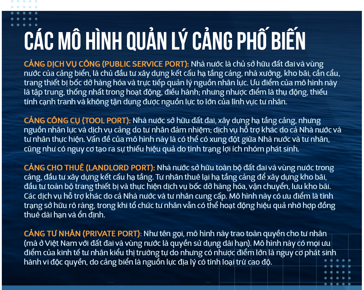 Theo tôi, điểm yếu nhất của cảng biển chúng ta hiện là chưa có một mô hình quản lý, đầu tư xây dựng, khai thác cảng biển hiện đại, đạt chuẩn mực quốc tế như nhiều nước mạnh về lĩnh vực hàng hải hiện nay như Hàn Quốc, Trung Quốc, Singarpore, Úc, Hà Lan, Bỉ...