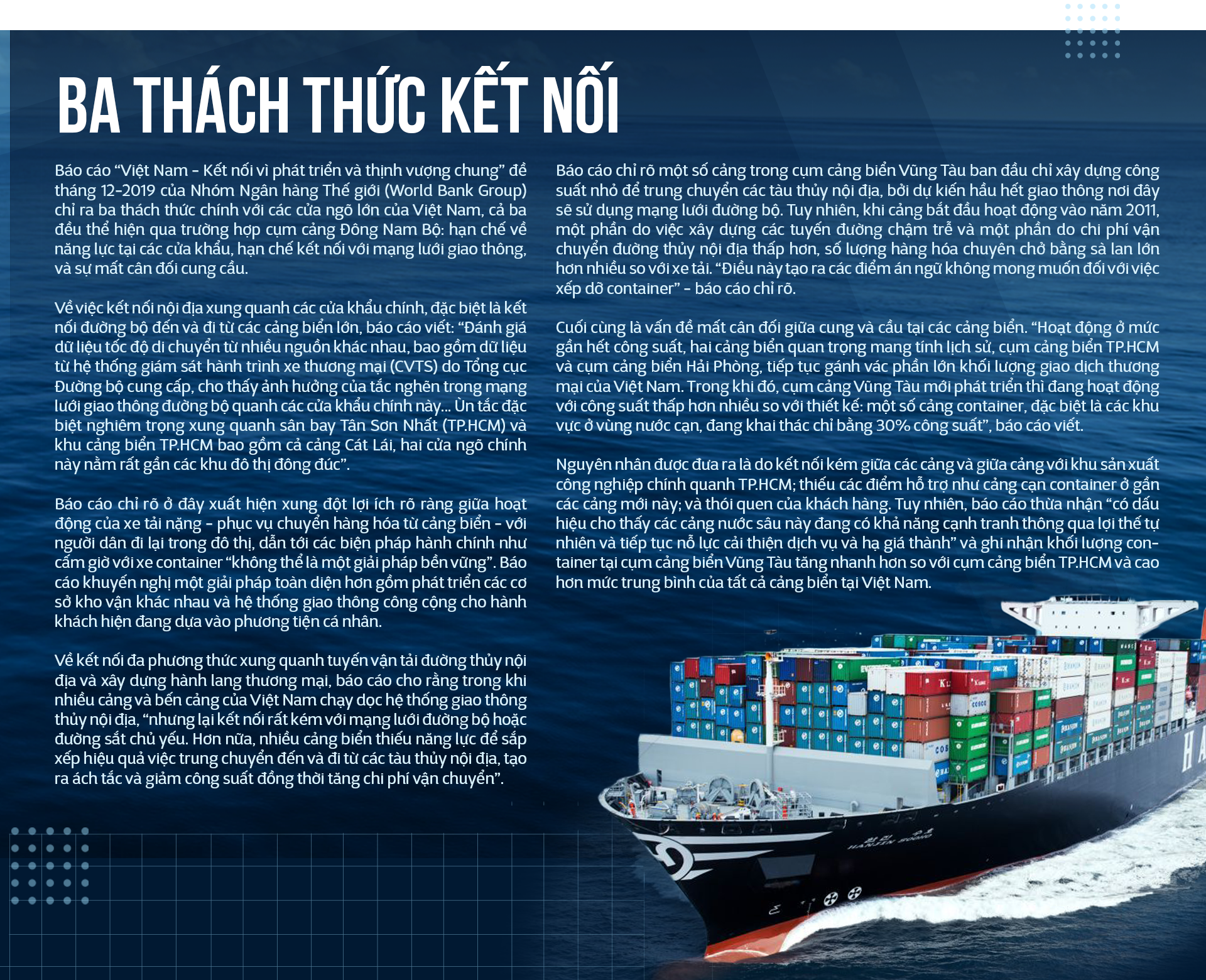 Nhiều vấn đề về quy hoạch, điều hành - quản trị cảng, và đặc biệt là kết nối với giao thông nội địa - thông qua đầu tư và cải thiện mạnh mẽ hơn nữa cơ sở hạ tầng, cần phải được giải quyết, bởi trong bất kỳ khát vọng thịnh vượng nào của Việt Nam, kinh tế biển vẫn sẽ luôn đóng một vai trò then chốt. Vấn đề là chúng ta đang sẵn sàng đối mặt với những vấn đề đó ở mức độ nào.