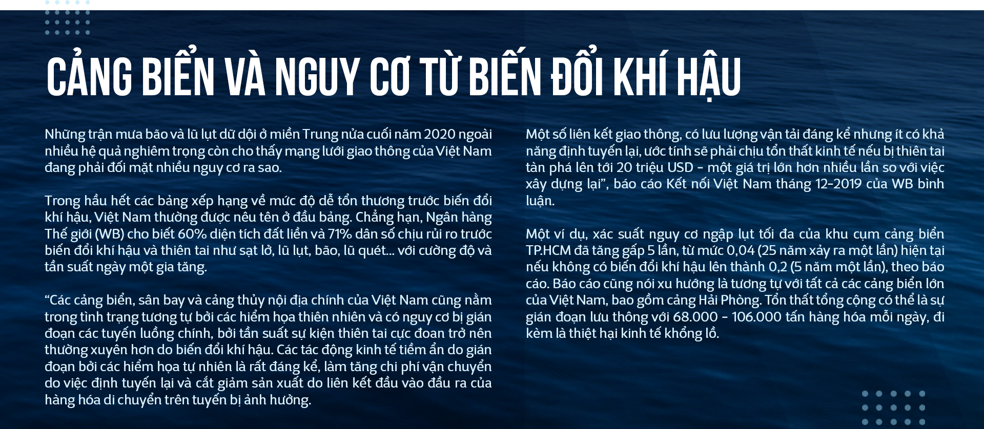 Việt Nam là một quốc gia kinh tế biển đã từ lâu đời. Đường bờ biển hơn 3.000km và hệ thống giao thông hàng hải cũng như nội thủy là những tuyến vận tải huyết mạch của quốc gia không chỉ trong thời hiện đại. Sự phát triển nhảy vọt của vận tải biển trong những năm sau đổi mới - một con số điển hình là lượng container luân chuyển qua các cảng biển Việt Nam đã tăng với tốc độ hơn 1.500% chỉ trong giai đoạn 2001-2019 (!) - đặt ra những đòi hỏi mới, khẩn thiết và quyết liệt với sự tổ chức hệ thống cảng biển trải dọc chiều dài đất nước.