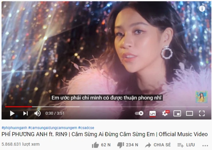 Dù bị chê bai đủ kiểu nhưng có ai ngờ đâu, cả ba MV của Phí Phương Anh lại có lượt xem đáng mơ ước đối với các ca sĩ trẻ. Trong khi ca khúc Cắm sừng ai đừng cắm sừng em cán mốc 5,8 triệu thì Cánh bướm dối gian cũng đạt con số hơn 4,9 triệu view.